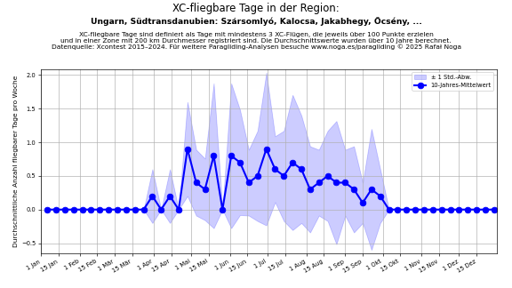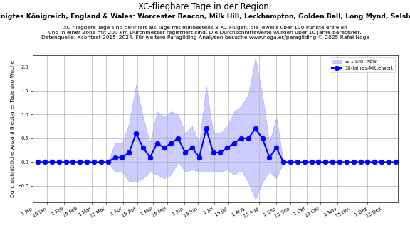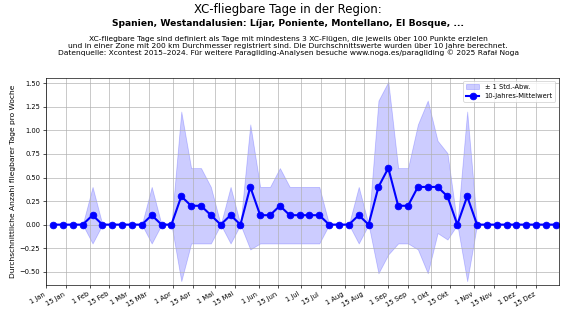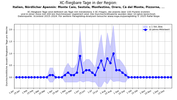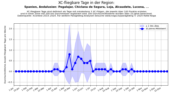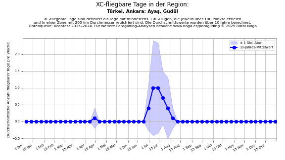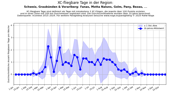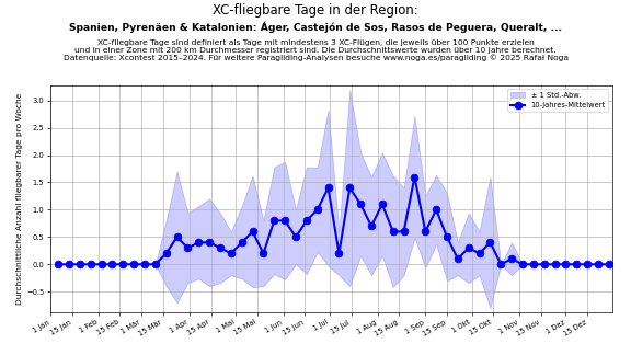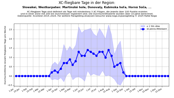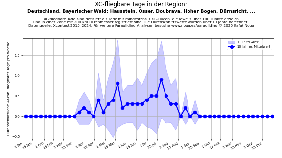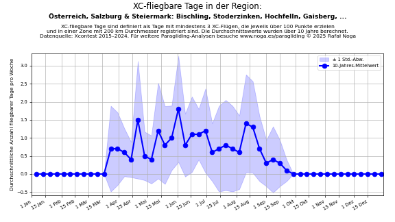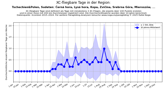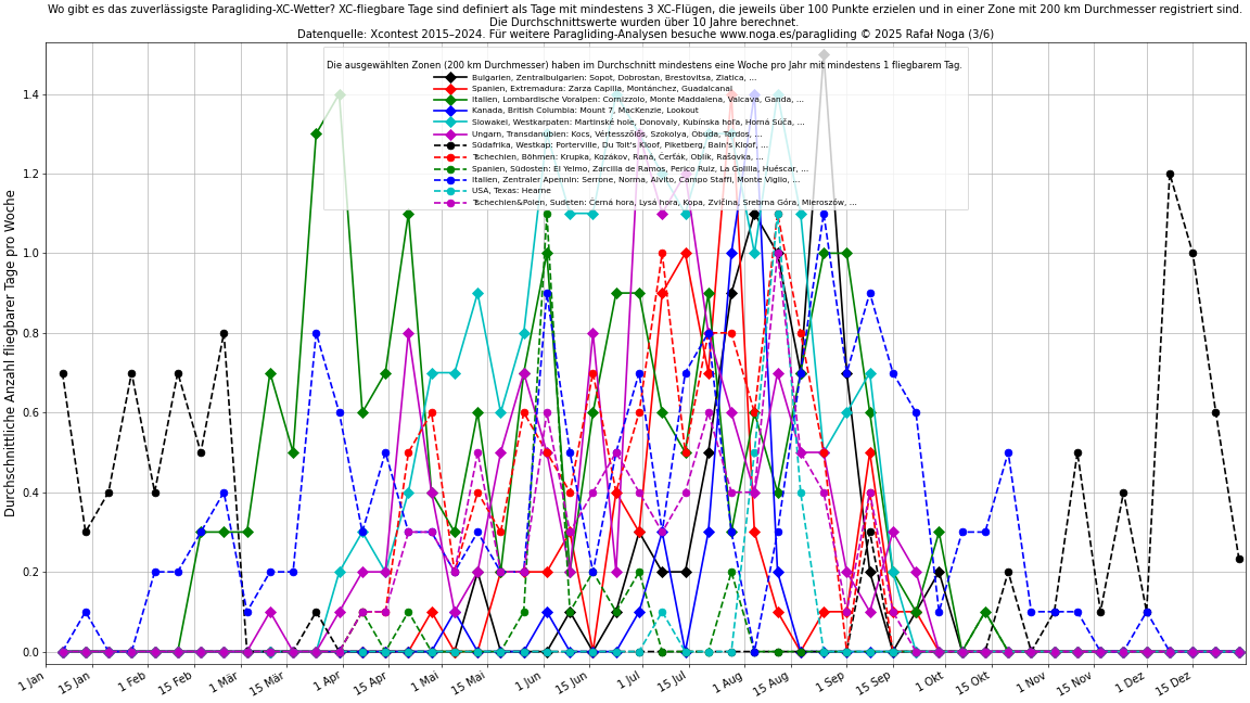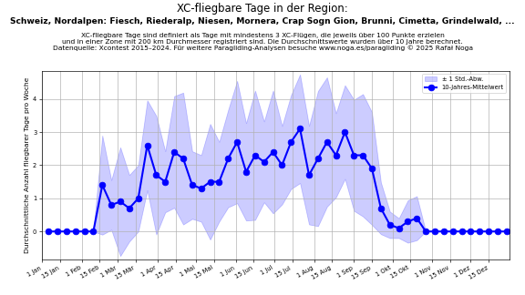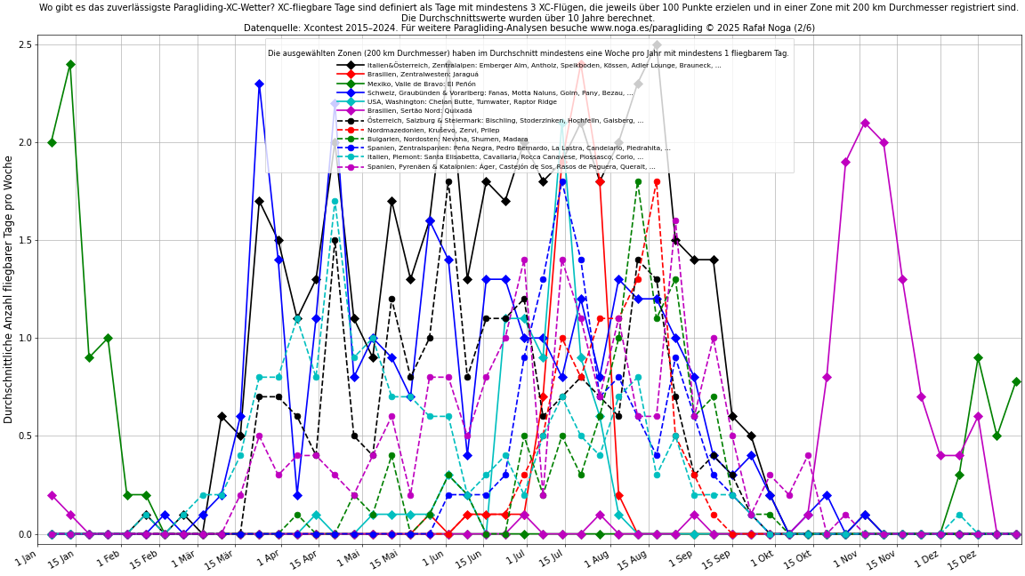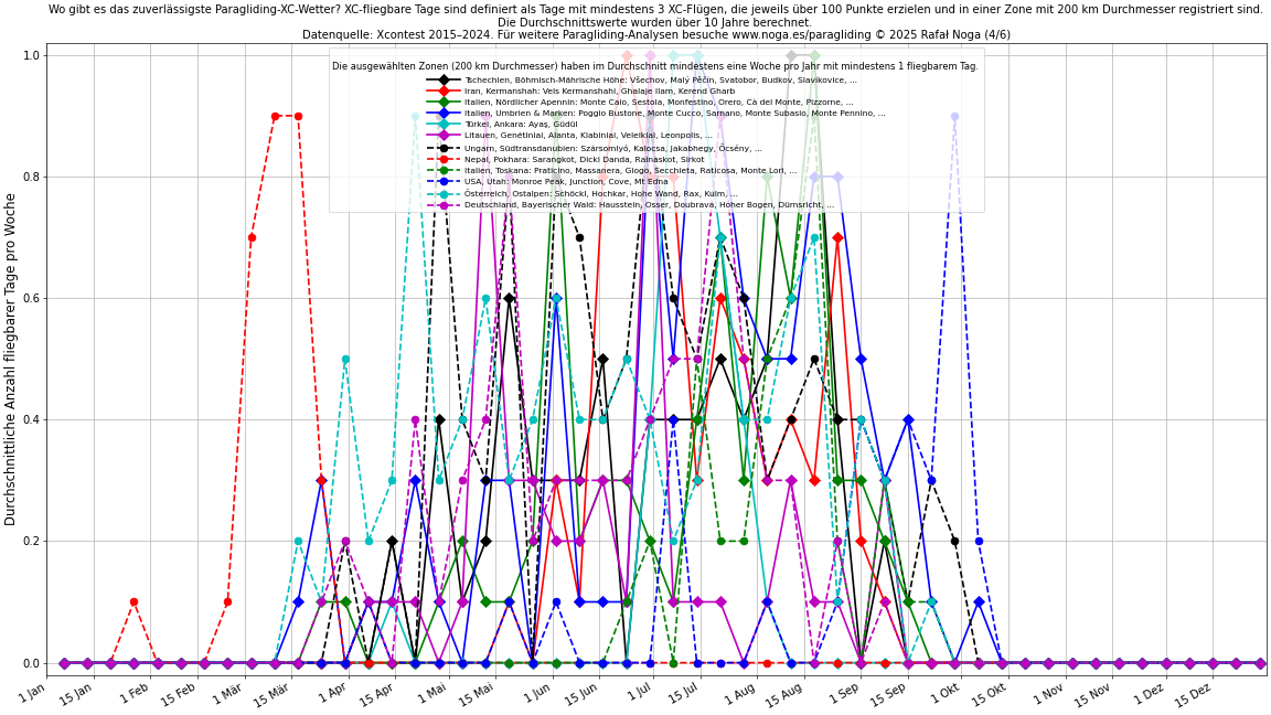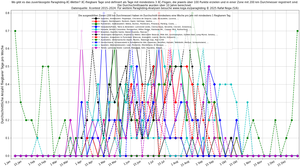 Fliegbare Tage sind definiert als Tage mit mindestens 3 Flügen, die jeweils über 100 Punkte erzielen und innerhalb einer 200-km-Durchmesser-Zone registriert sind. Mittelwerte über 10 Jahre berechnet. Datenquelle: Xcontest 2015–2024.