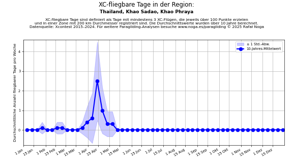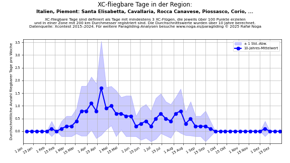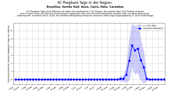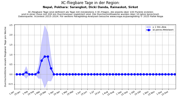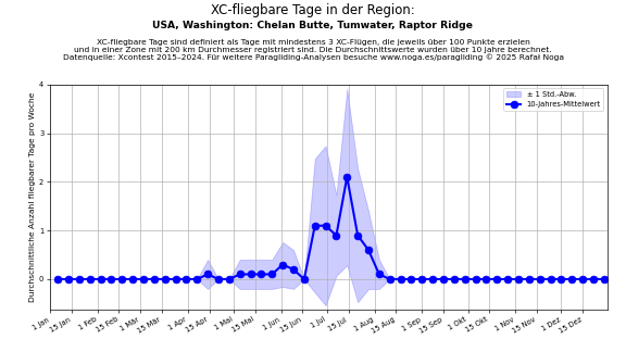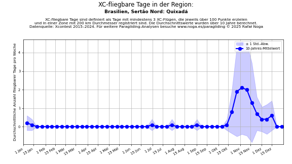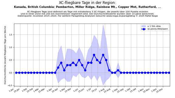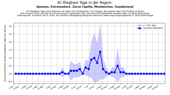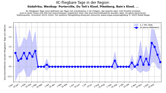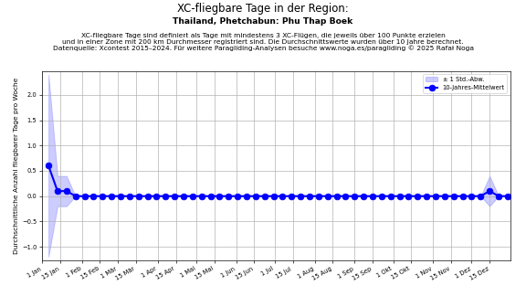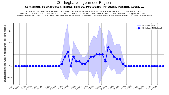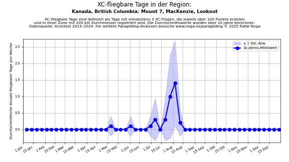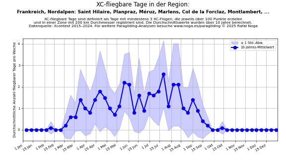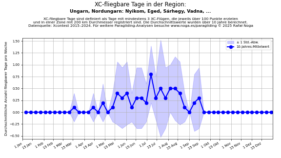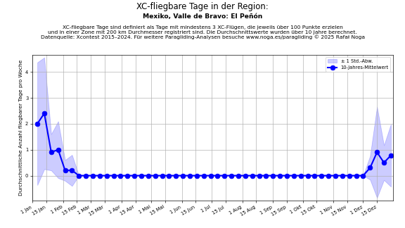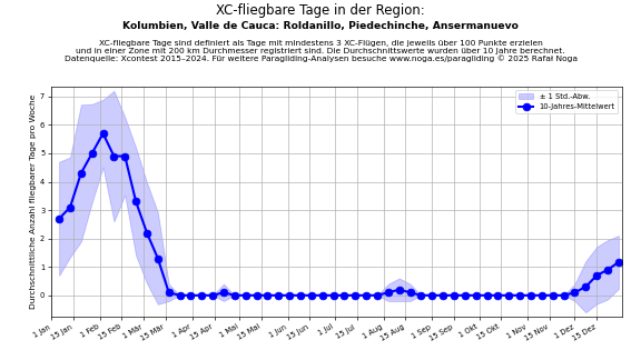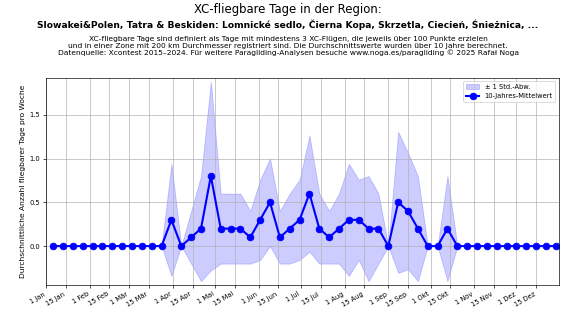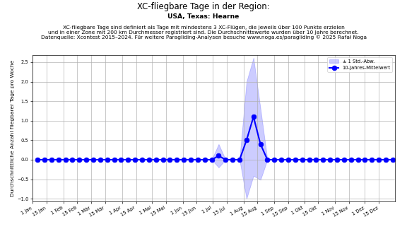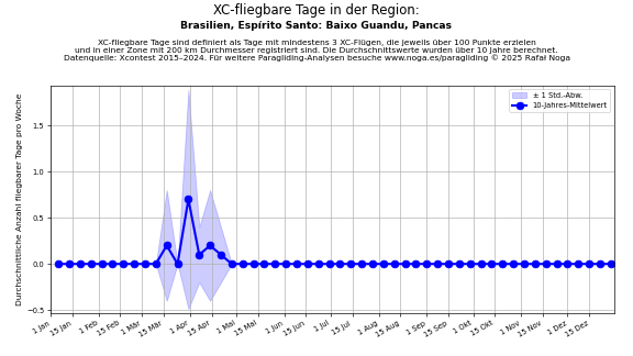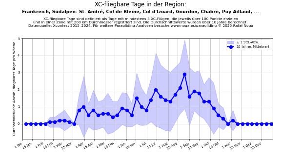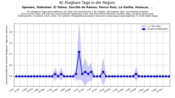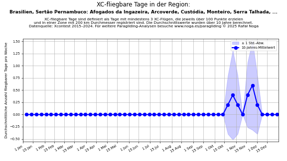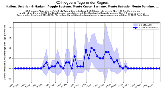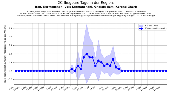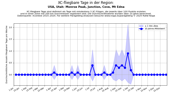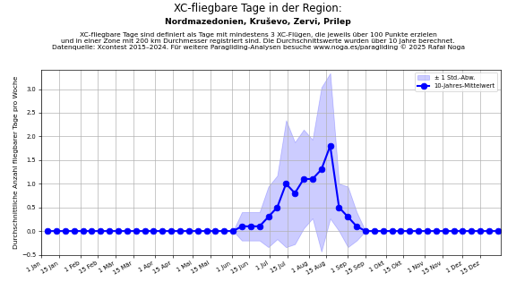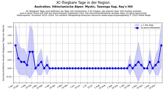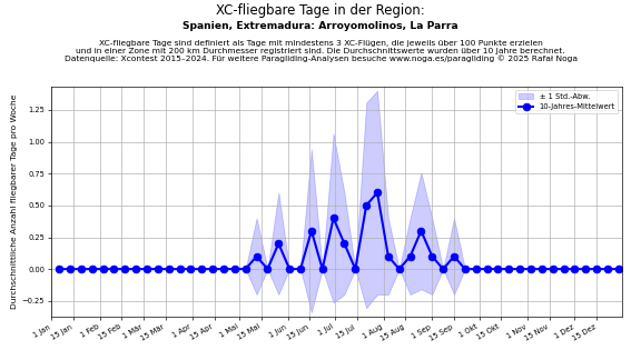 Fliegbare Tage sind definiert als Tage mit mindestens 3 Flügen, die jeweils über 100 Punkte erzielen und innerhalb einer 200-km-Durchmesser-Zone registriert sind. Mittelwerte über 10 Jahre berechnet. Datenquelle: Xcontest 2015–2024.