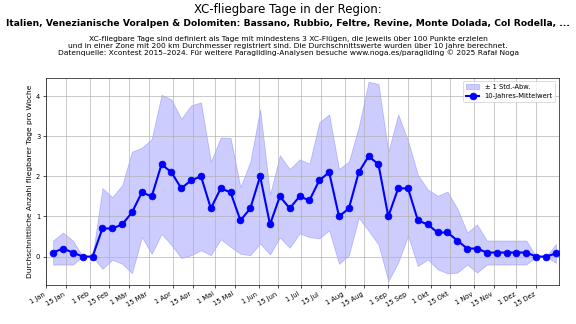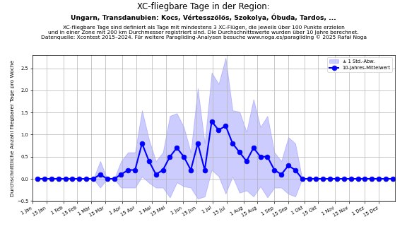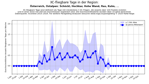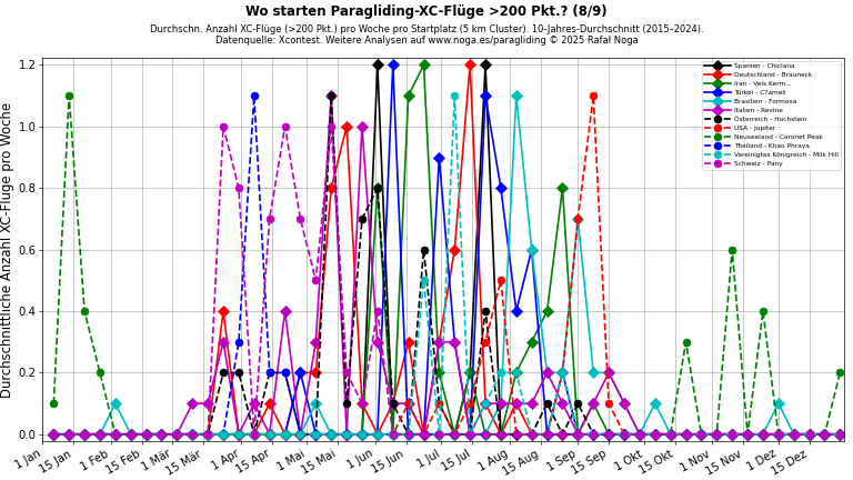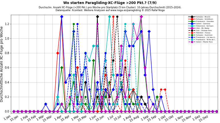 Durchschnittliche Anzahl XC-Flüge (>100 Pkt.) pro Woche pro Startplatz (5 km Cluster), 10-Jahres-Durchschnitt (2015–2024). Klicken Sie auf ein Diagramm für Vollbild. Datenquelle: Xcontest.