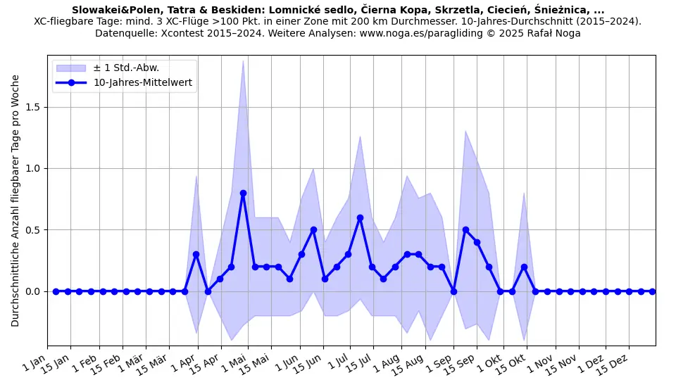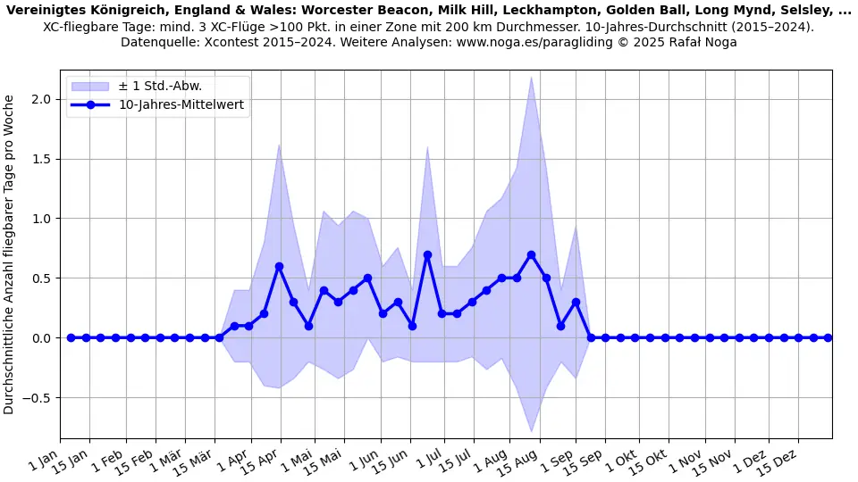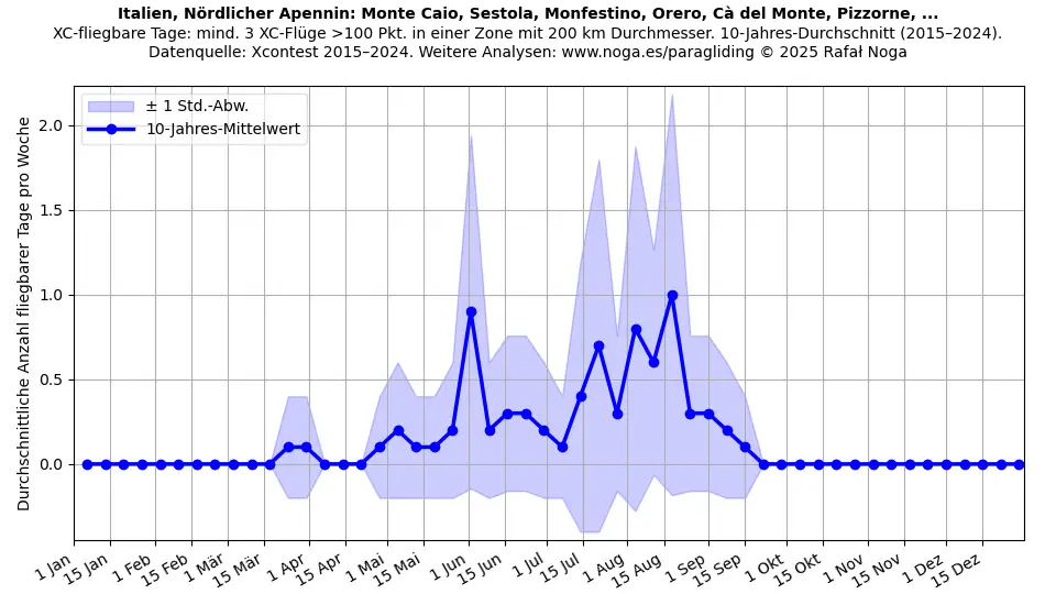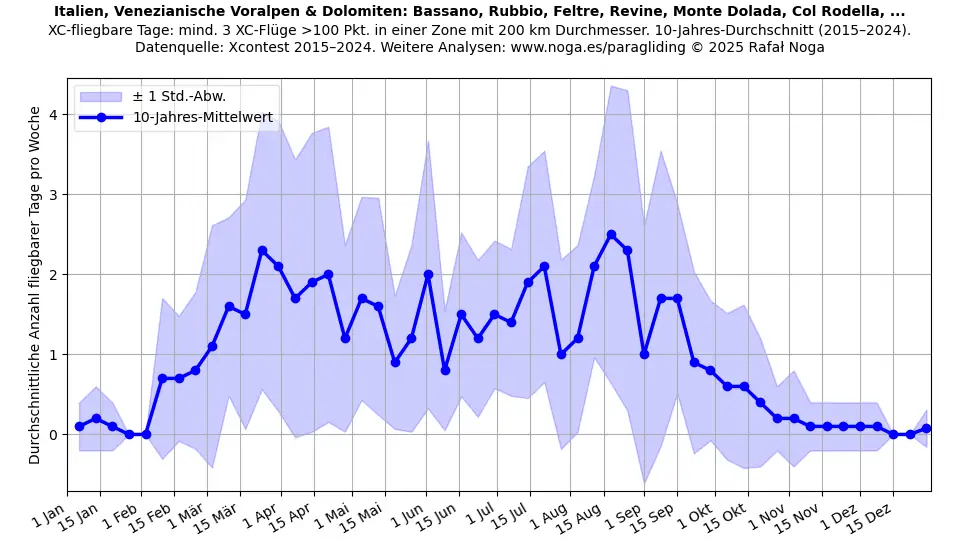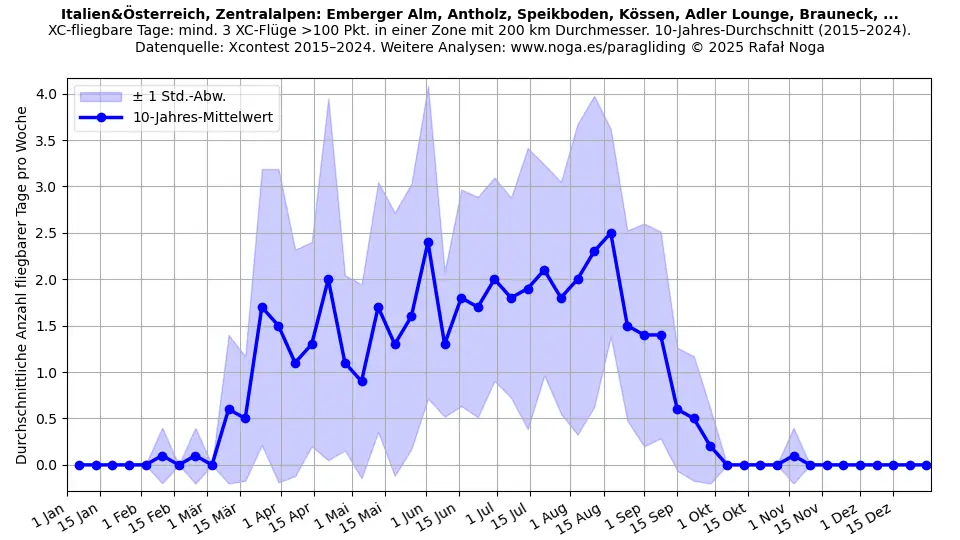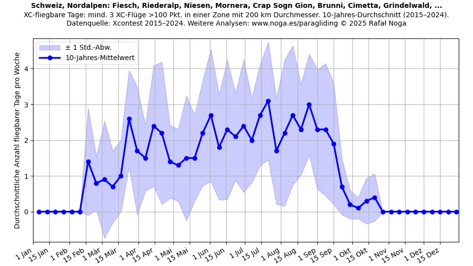 Fliegbare Tage sind definiert als Tage mit mindestens 3 Flügen, die jeweils über 100 Punkte erzielen und innerhalb einer 200-km-Durchmesser-Zone registriert sind. Mittelwerte über 11 Jahre berechnet. Datenquelle: Xcontest 2015–2025.