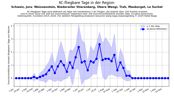 Durchschnittliche Anzahl XC-Flüge pro Woche pro Startplatz (5 km Cluster), 10-Jahres-Durchschnitt (2015–2024). Datenquelle: Xcontest.