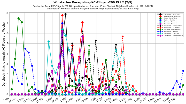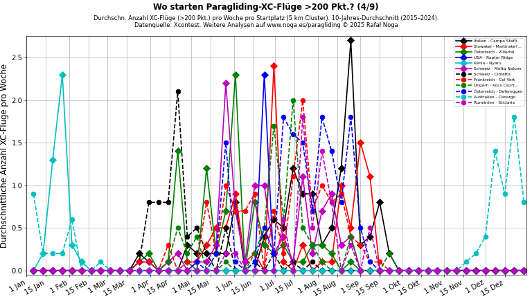 Entdecken Sie, wo und wann Piloten Streckenflug fliegen. Analyse von 10 Jahren XContest-Daten mit den zuverlässigsten Startplätzen nach Land und Saison.