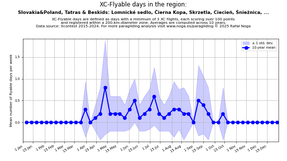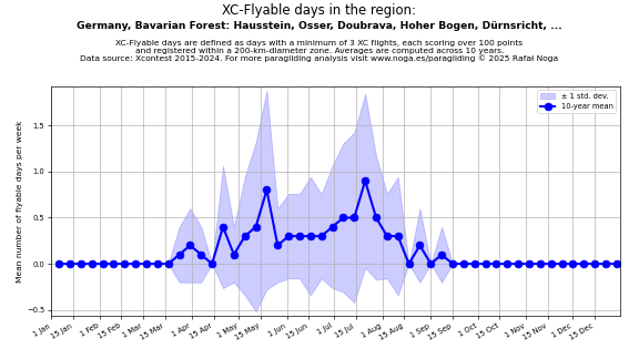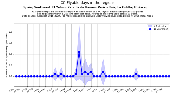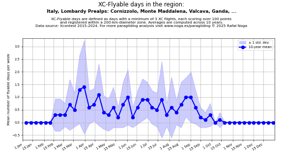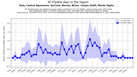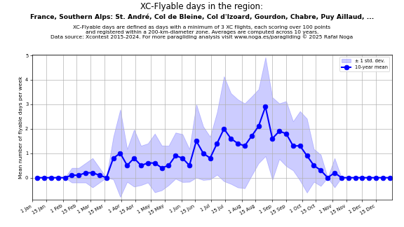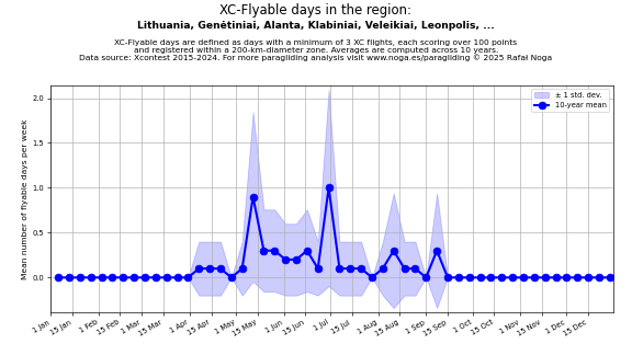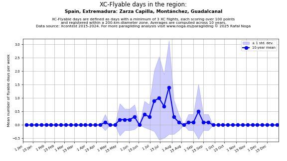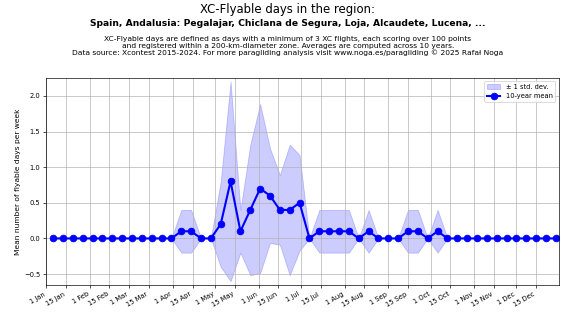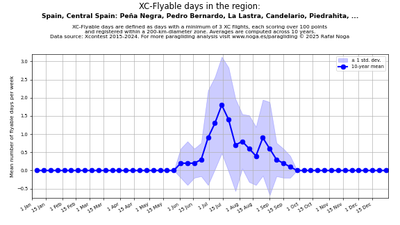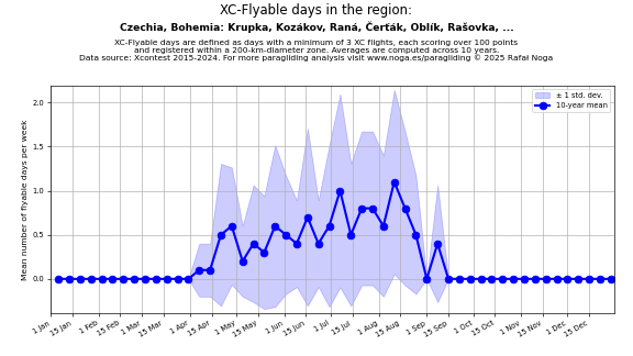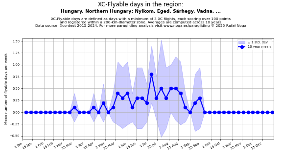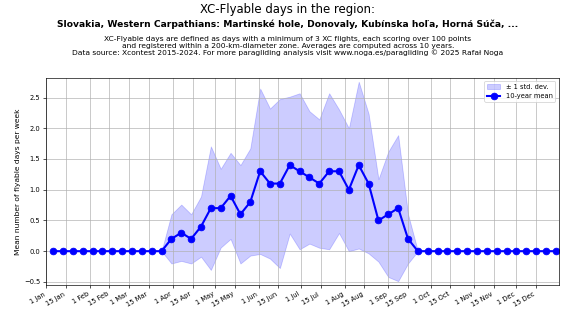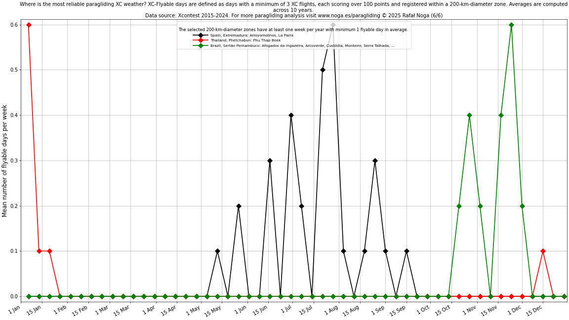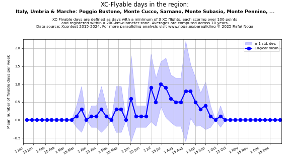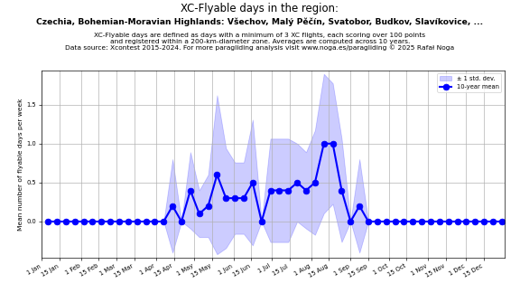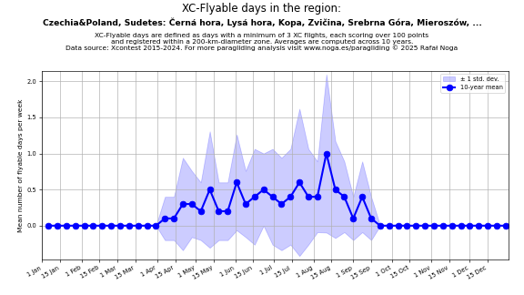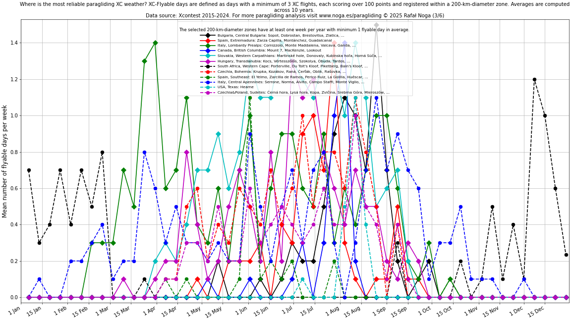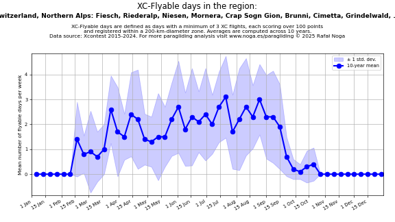 Flyable days are defined as days with a minimum of 3 flights, each scoring over 100 points and registered within a 200-km-diameter zone. Averages are computed across 10 years. Data source: Xcontest 2015-2024.