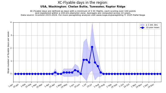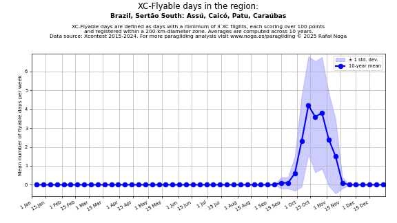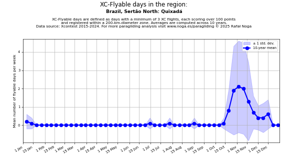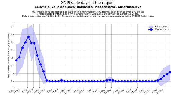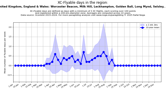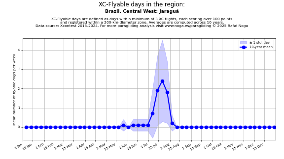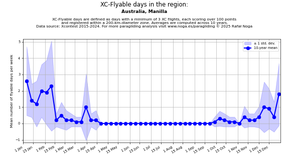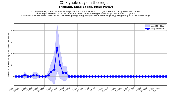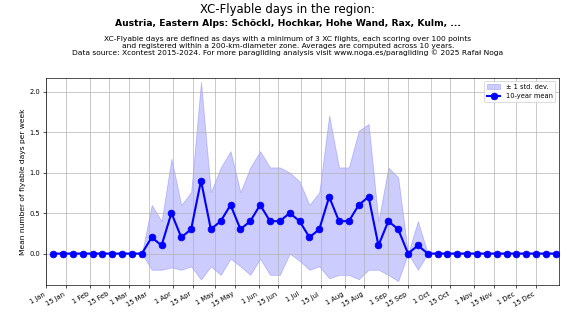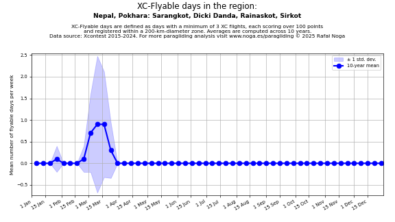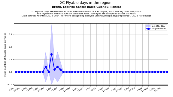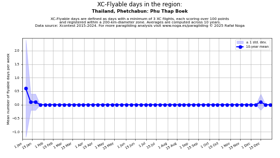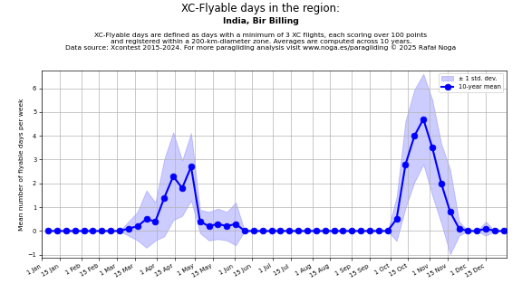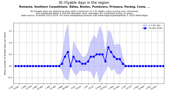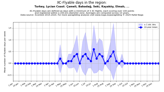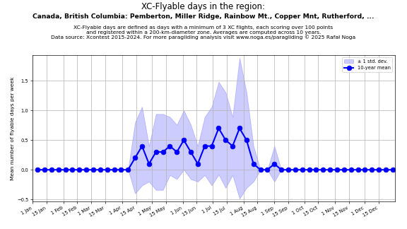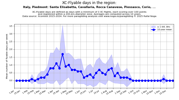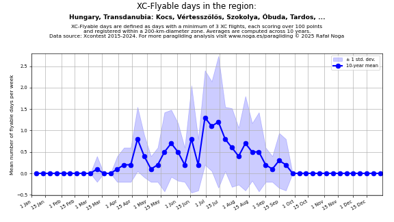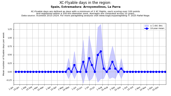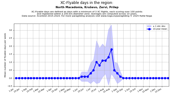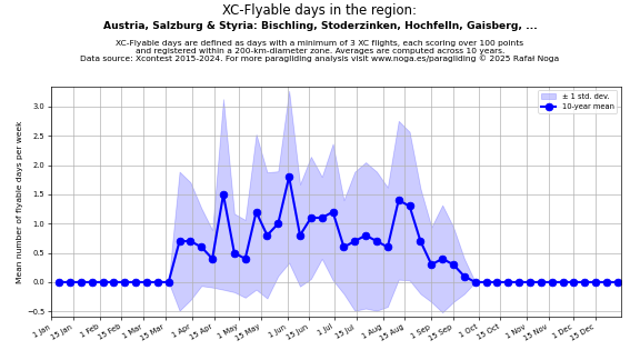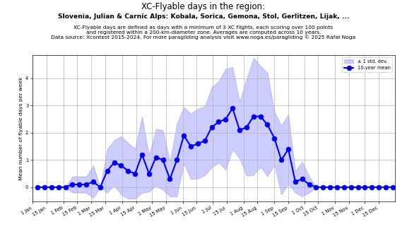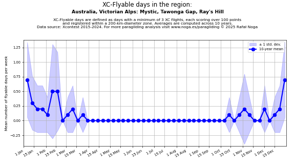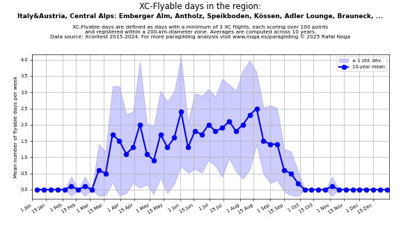 Flyable days are defined as days with a minimum of 3 flights, each scoring over 100 points and registered within a 200-km-diameter zone. Averages are computed across 10 years. Data source: Xcontest 2015-2024.
