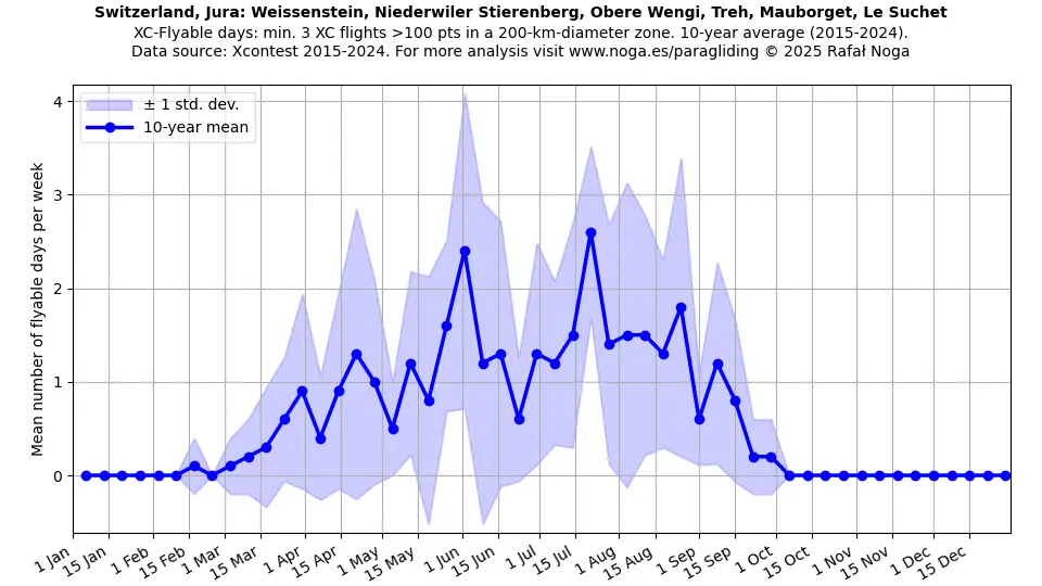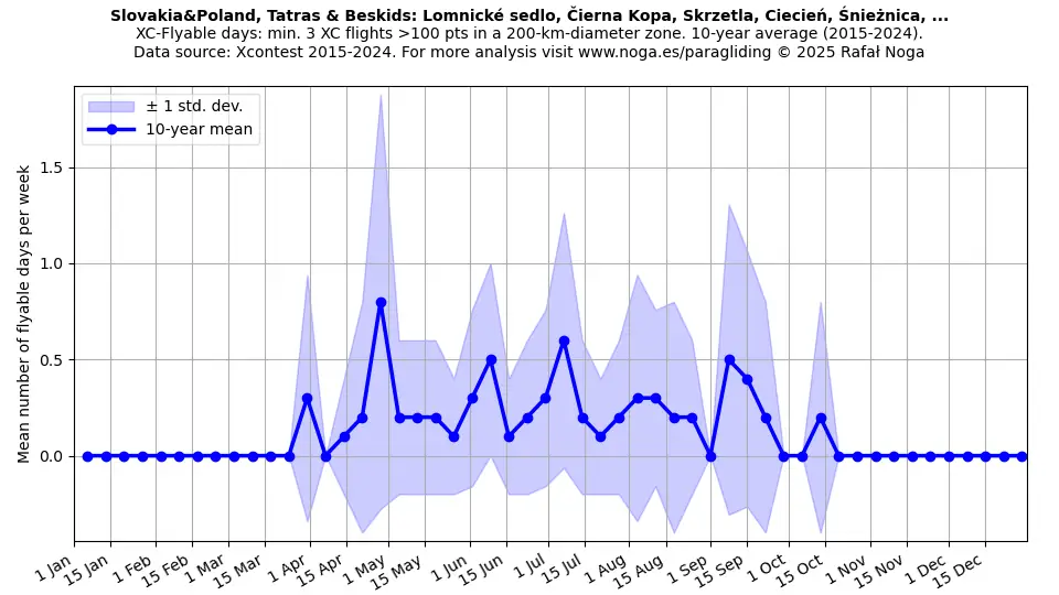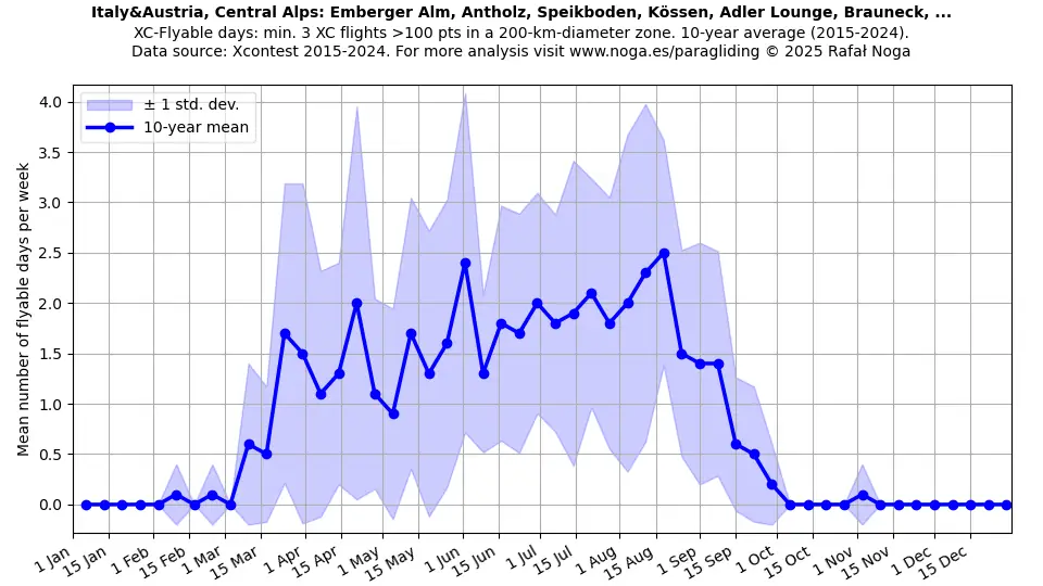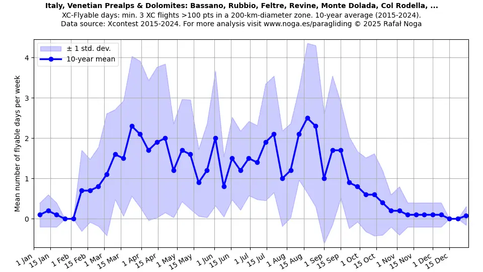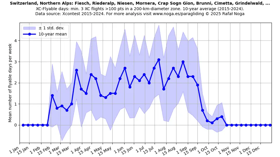 Flyable days are defined as days with a minimum of 3 flights, each scoring over 100 points and registered within a 200-km-diameter zone. Averages are computed across 11 years. Data source: Xcontest 2015–2025.