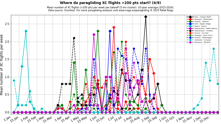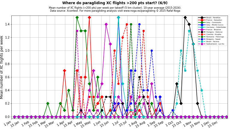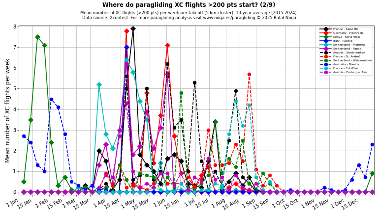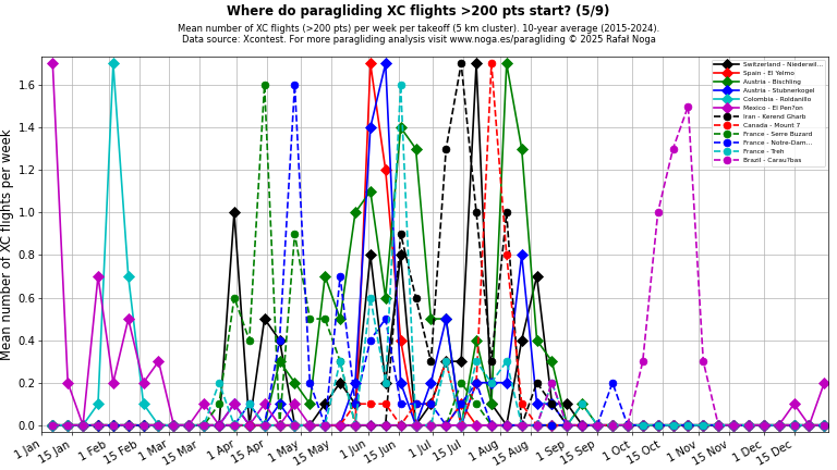 Average number of XC flights per week per takeoff (5 km cluster), 10-year average (2015–2024). Data source: Xcontest.