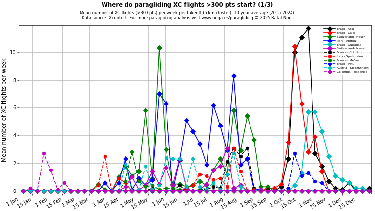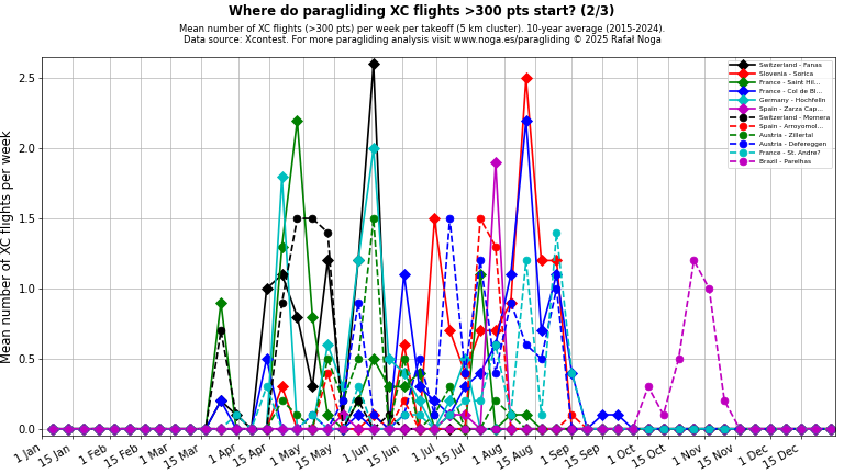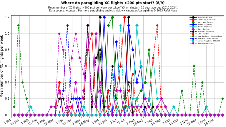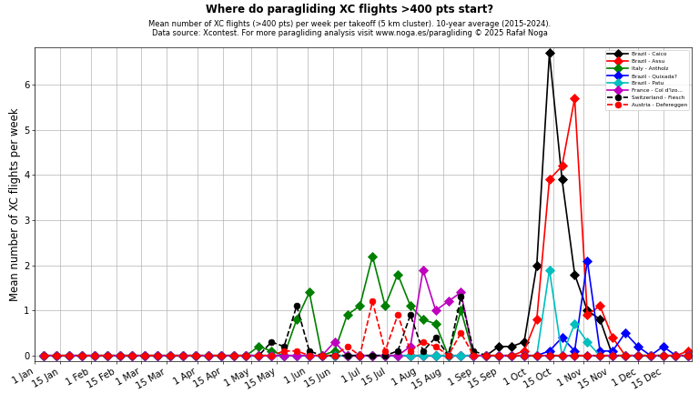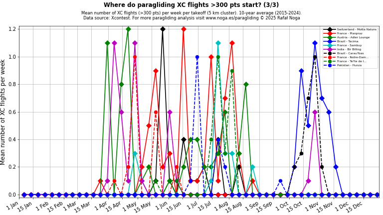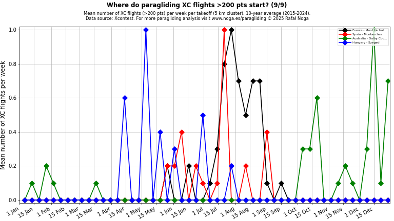 Average number of XC flights (>100 points) per week per takeoff (5 km cluster), 10-year average (2015–2024). Click on any chart to view full size. Data source: Xcontest.