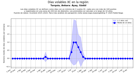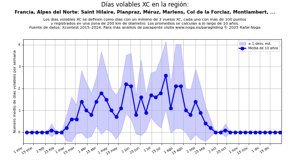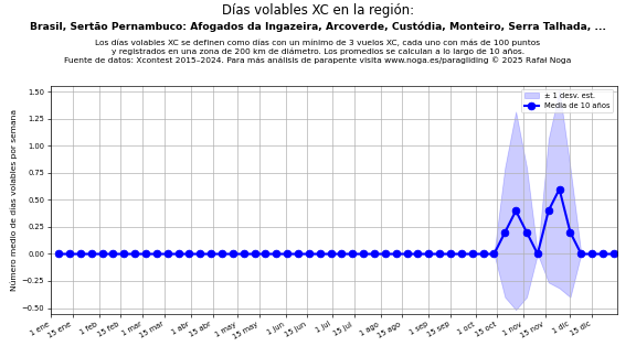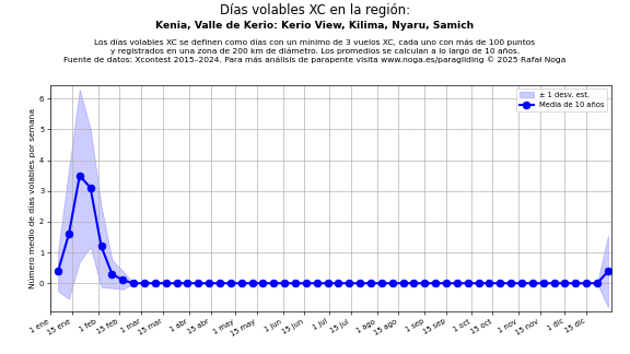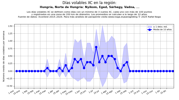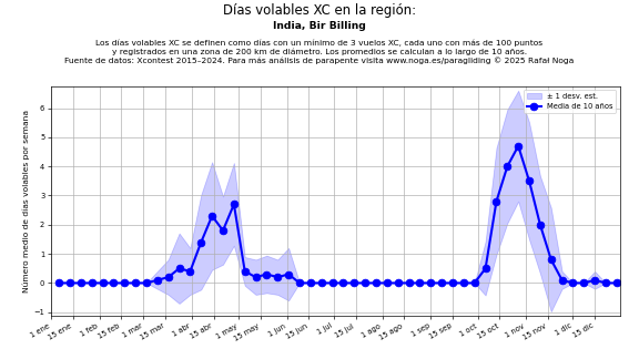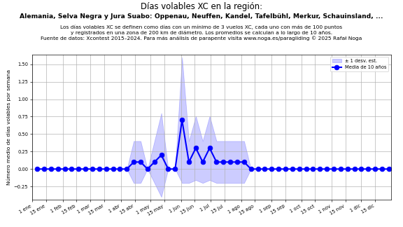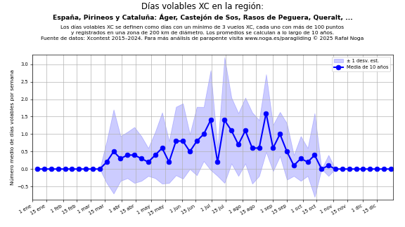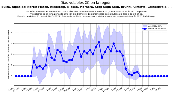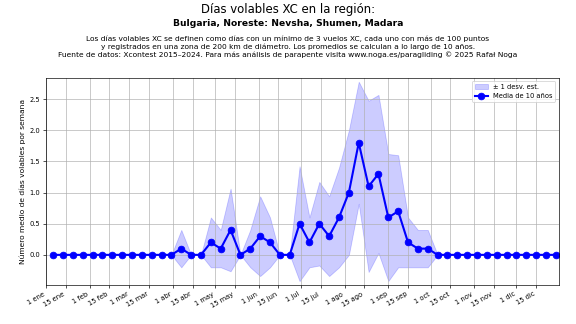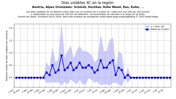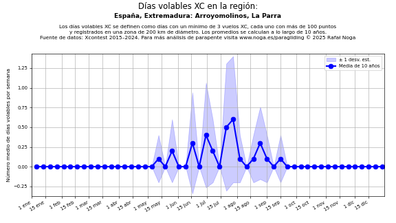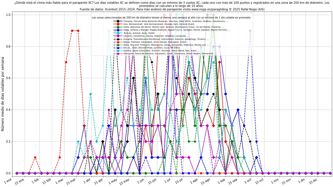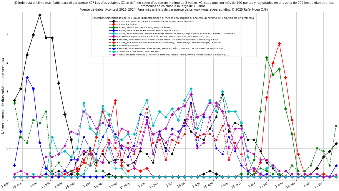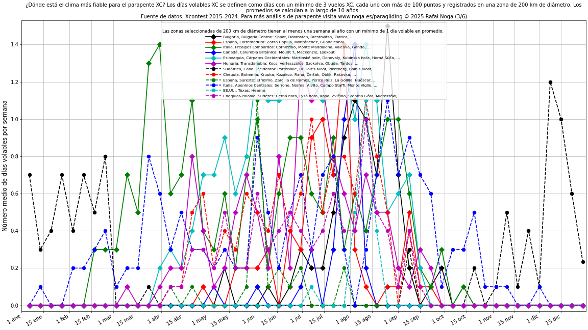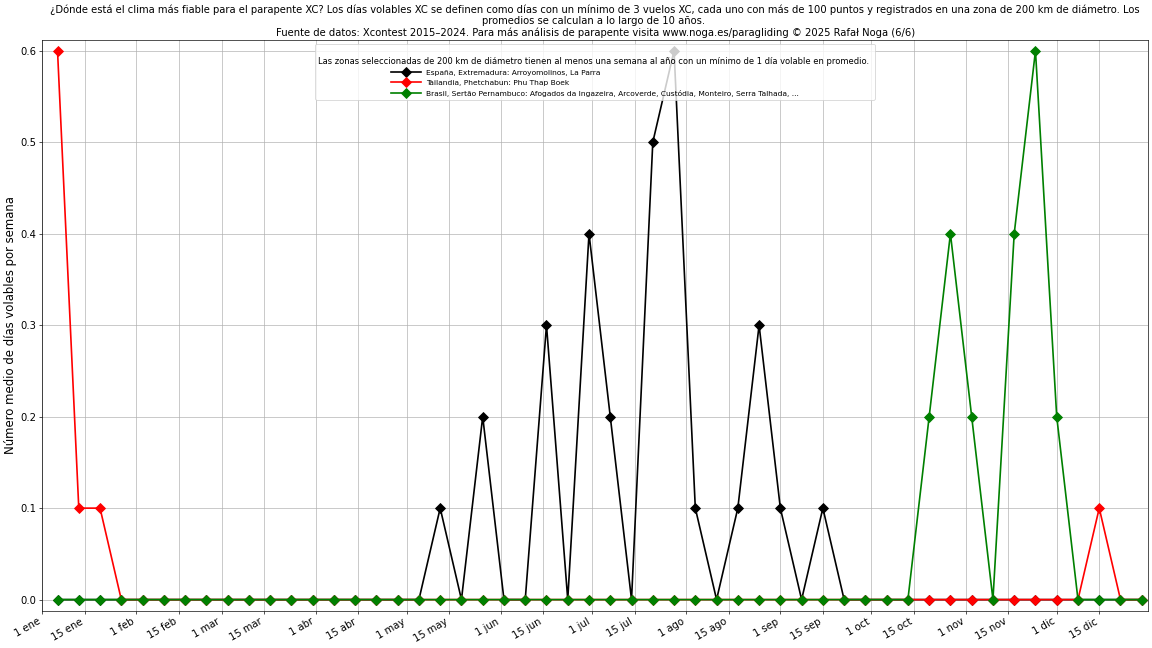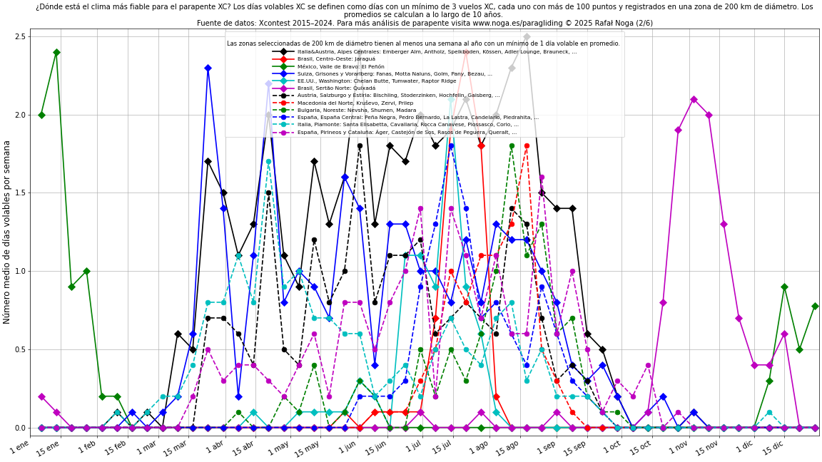 Los días volables se definen como días con un mínimo de 3 vuelos, cada uno con más de 100 puntos y registrados en una zona de 200 km de diámetro. Promedios calculados sobre 10 años. Fuente: Xcontest 2015–2024.