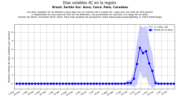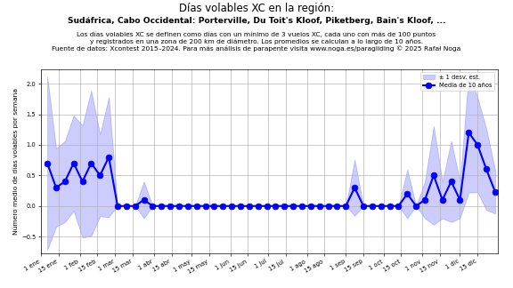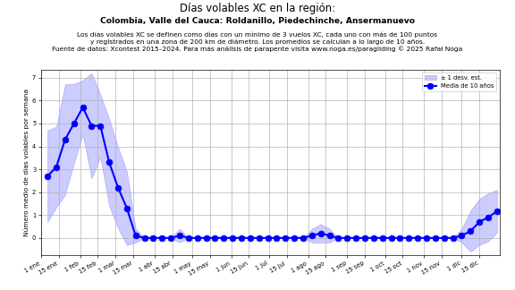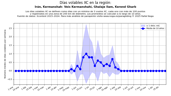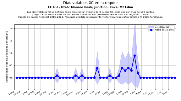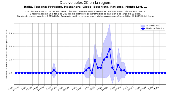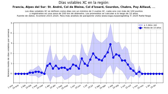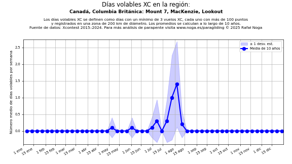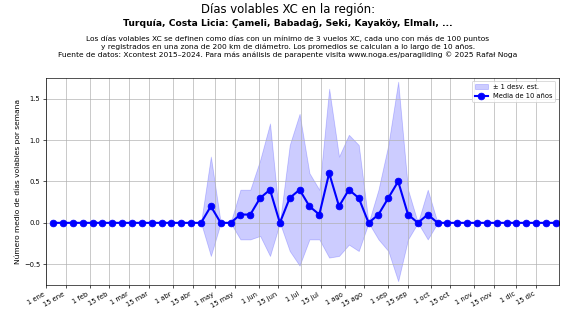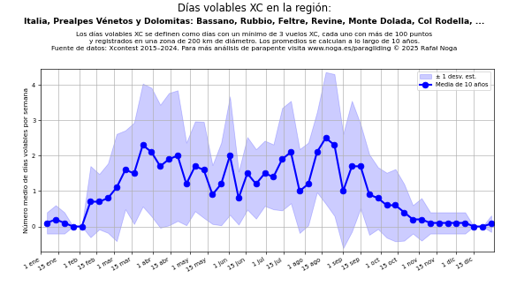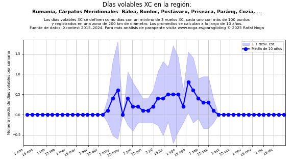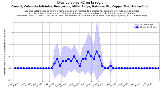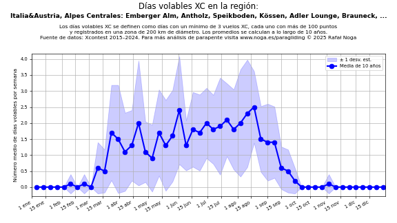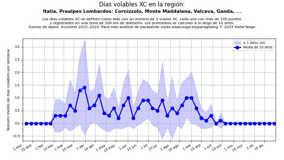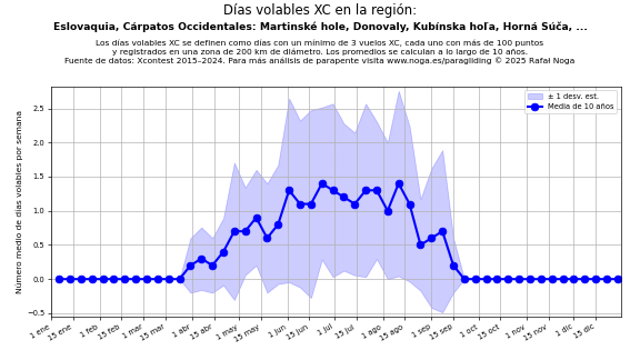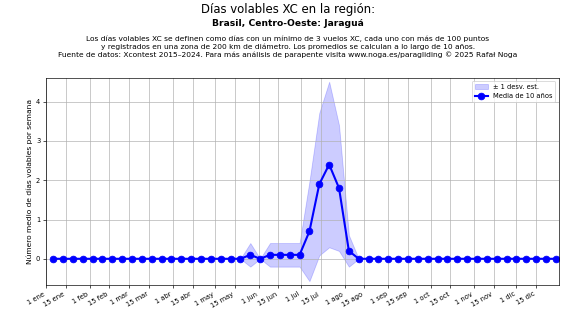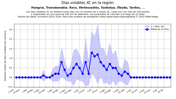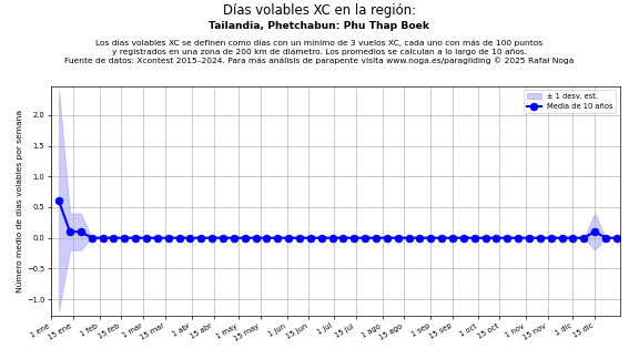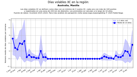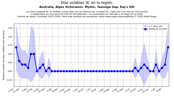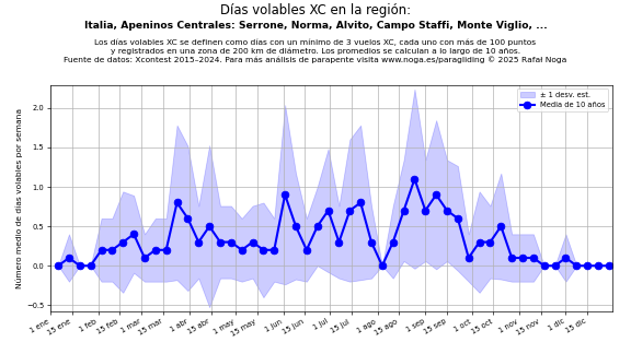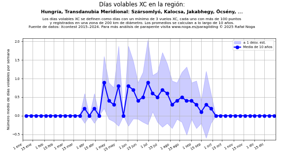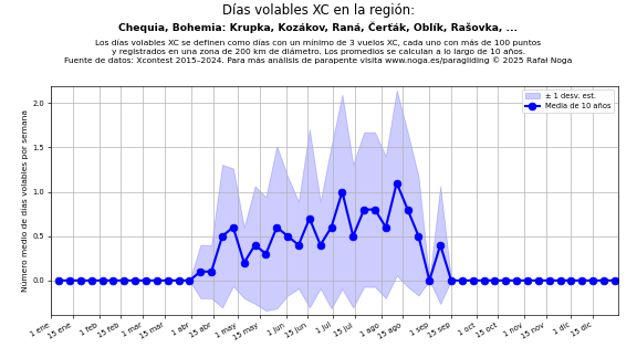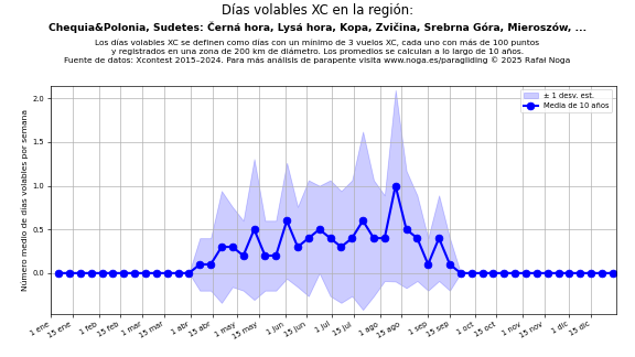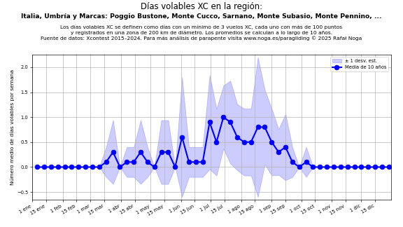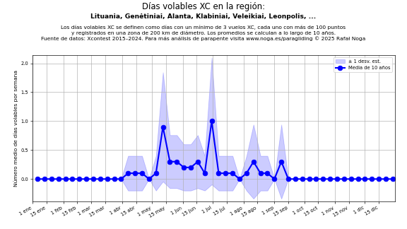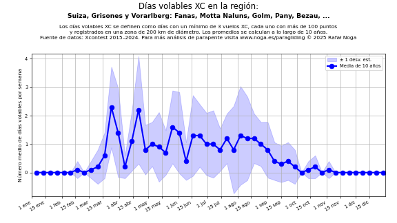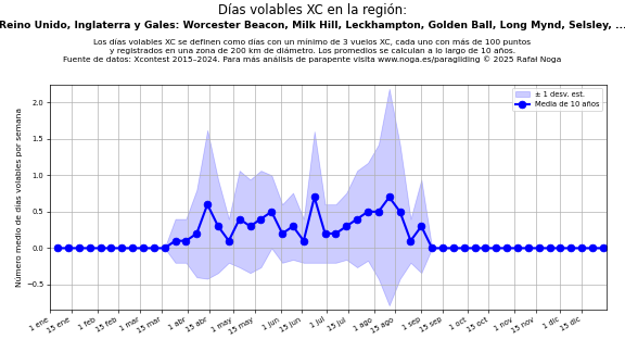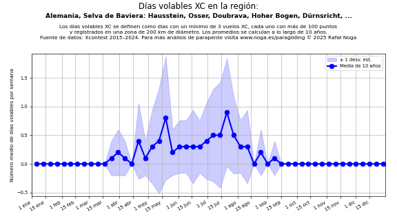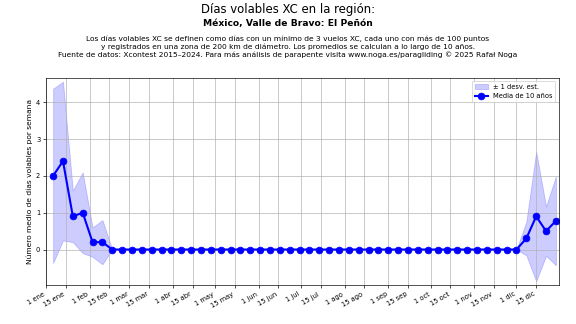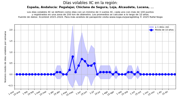 Los días volables se definen como días con un mínimo de 3 vuelos, cada uno con más de 100 puntos y registrados en una zona de 200 km de diámetro. Promedios calculados sobre 10 años. Fuente: Xcontest 2015–2024.