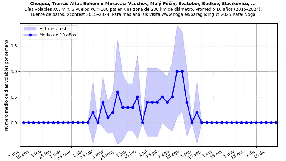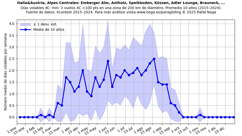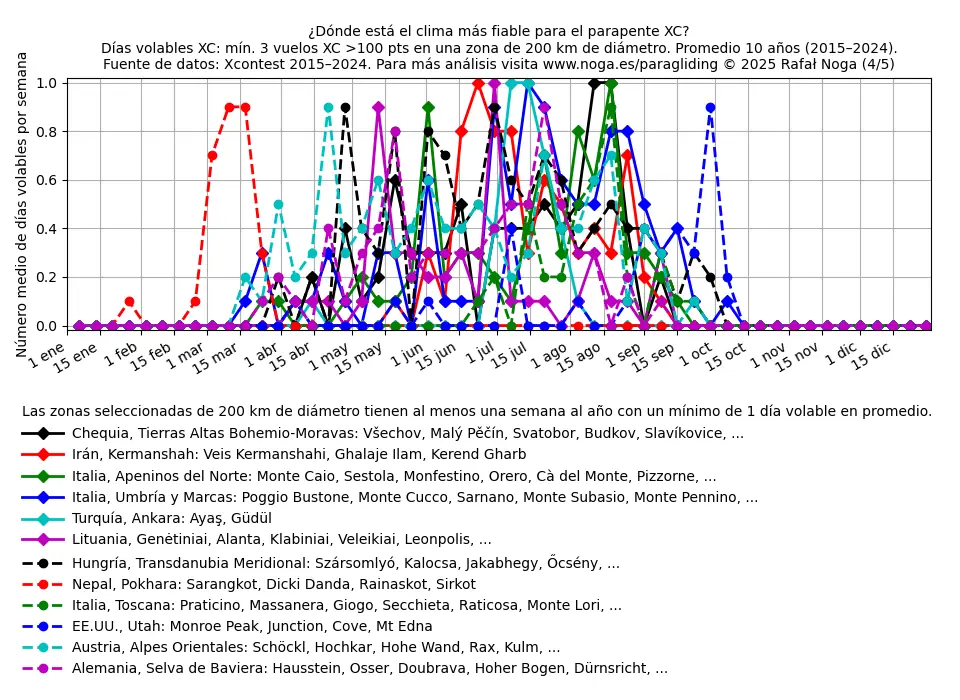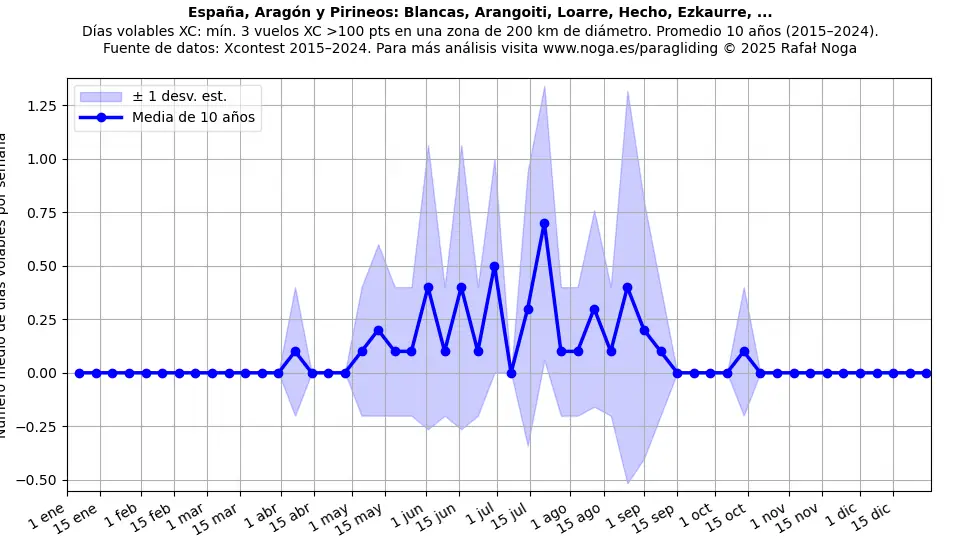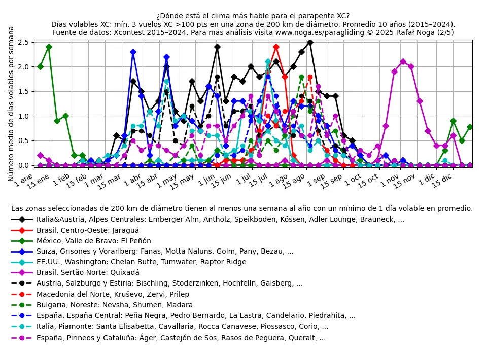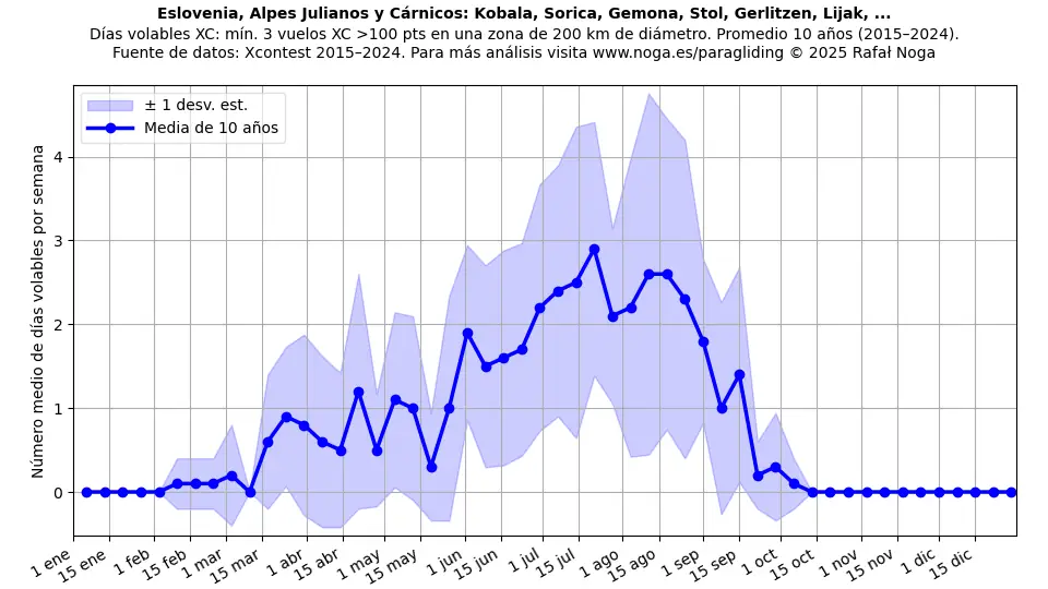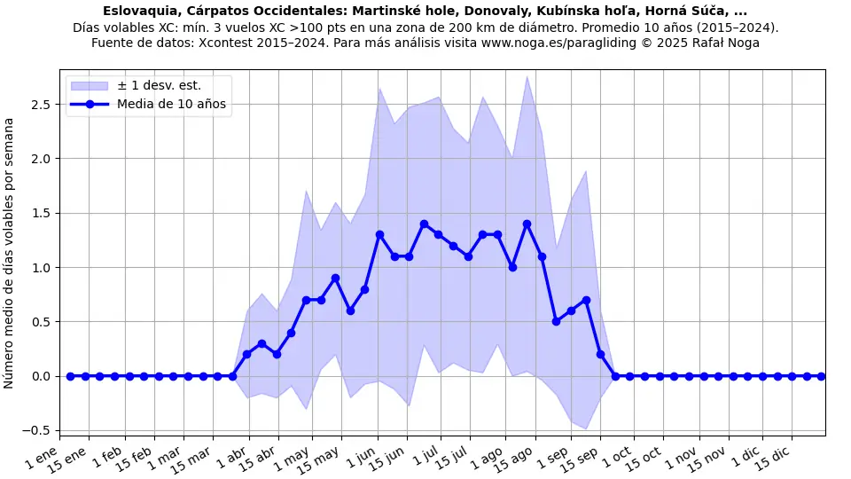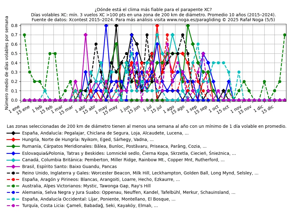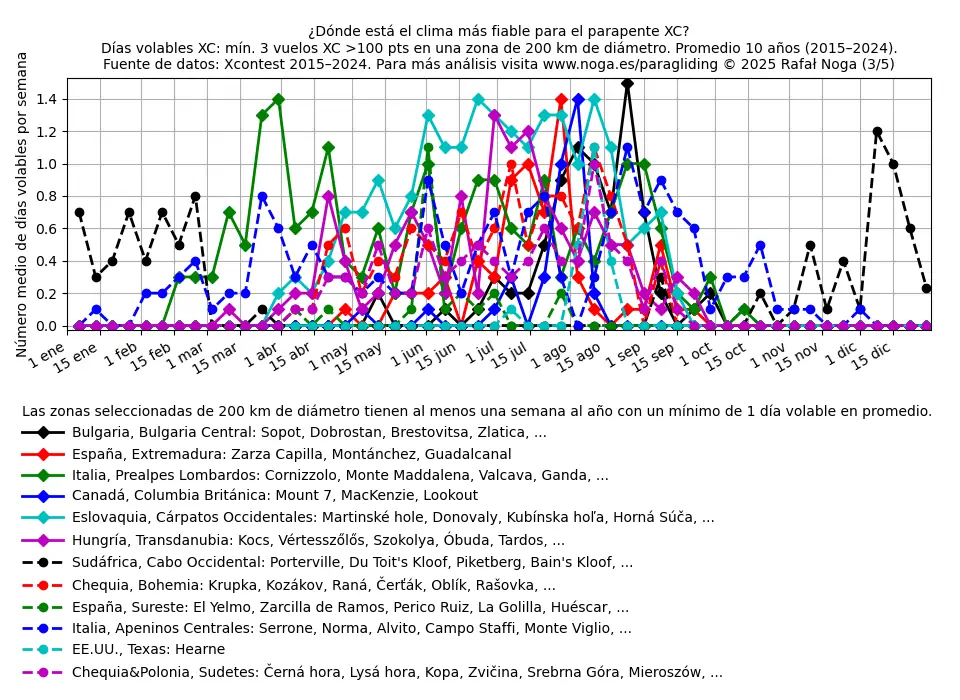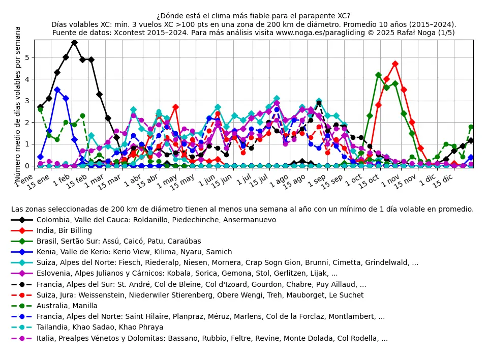 Los días volables se definen como días con un mínimo de 3 vuelos, cada uno con más de 100 puntos y registrados en una zona de 200 km de diámetro. Promedios calculados sobre 11 años. Fuente: Xcontest 2015–2025.