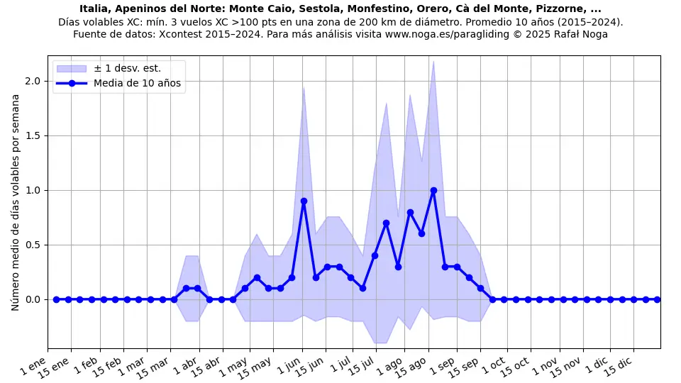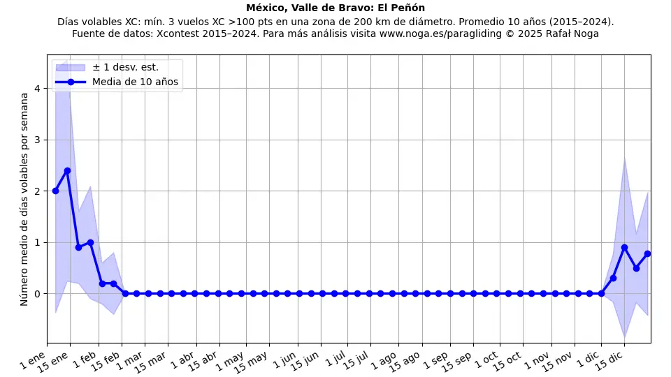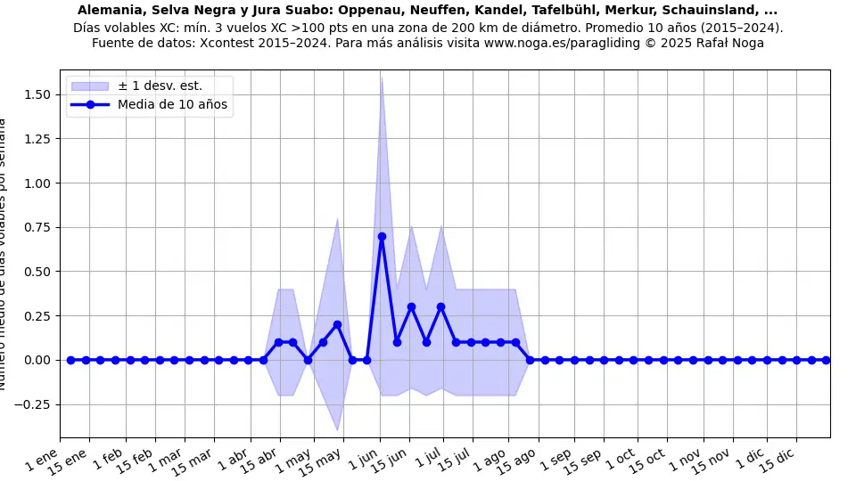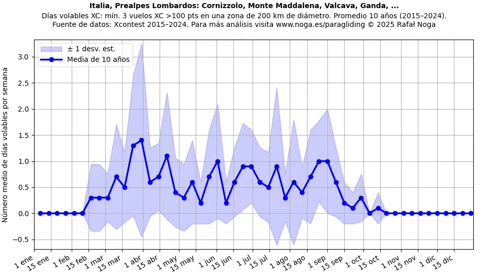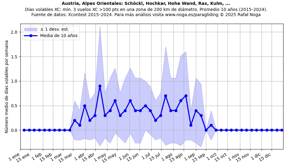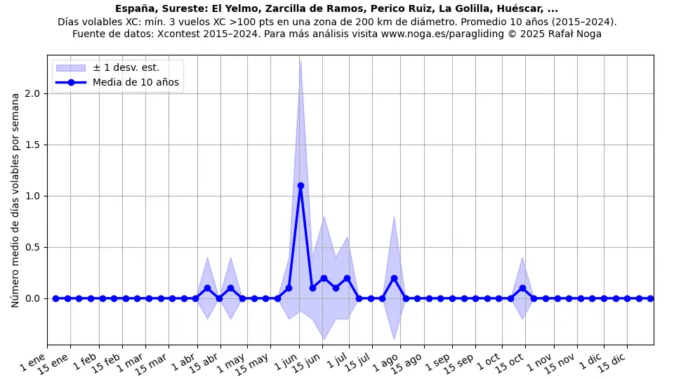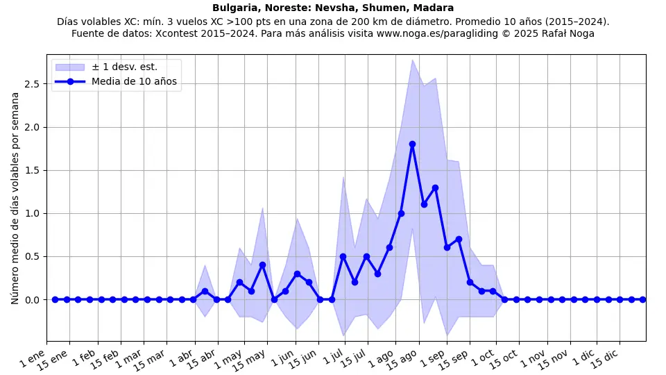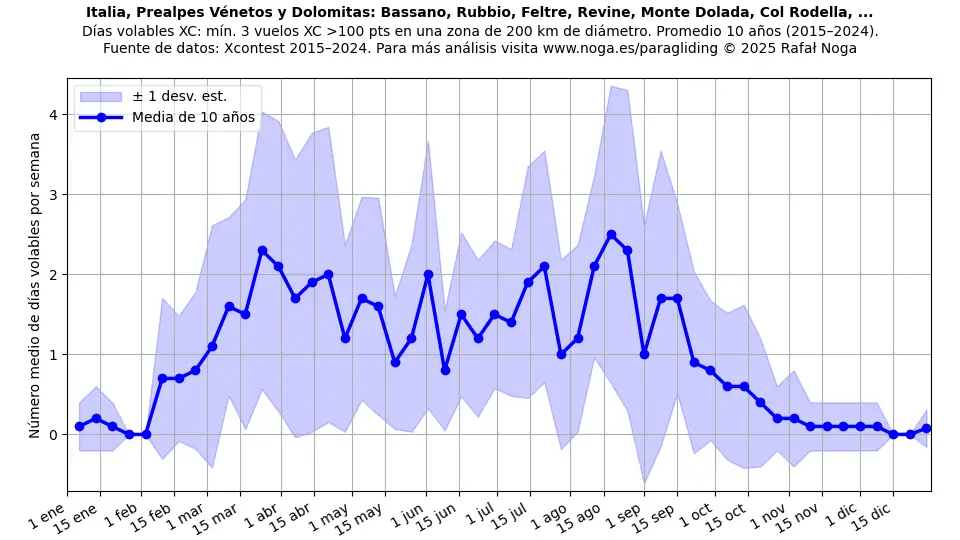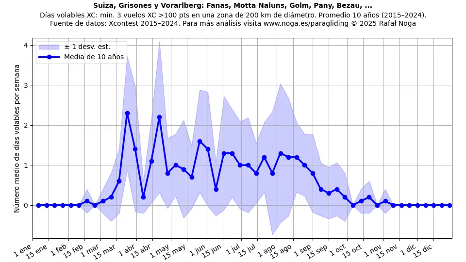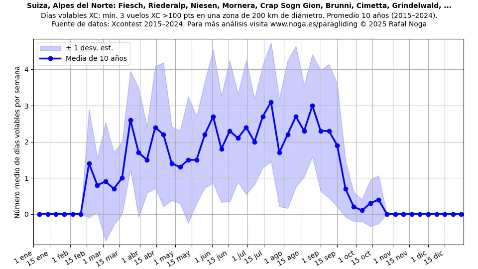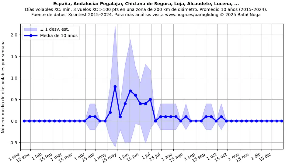 Los días volables se definen como días con un mínimo de 3 vuelos, cada uno con más de 100 puntos y registrados en una zona de 200 km de diámetro. Promedios calculados sobre 11 años. Fuente: Xcontest 2015–2025.