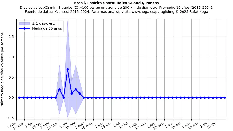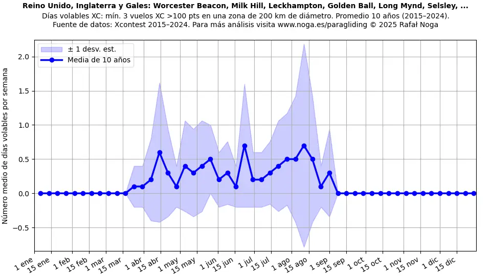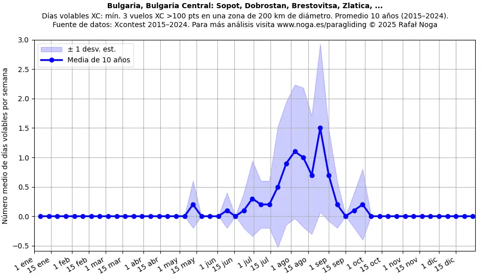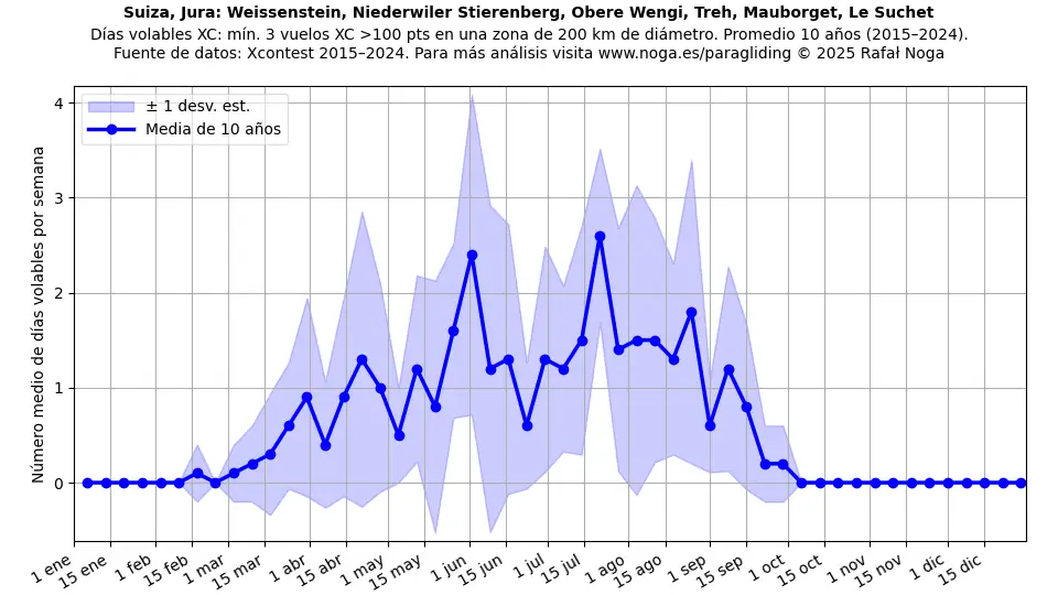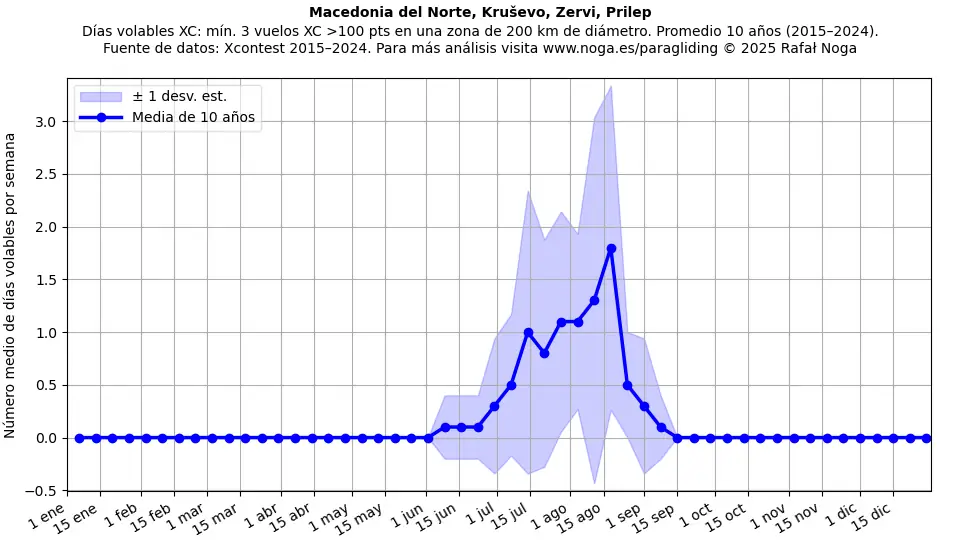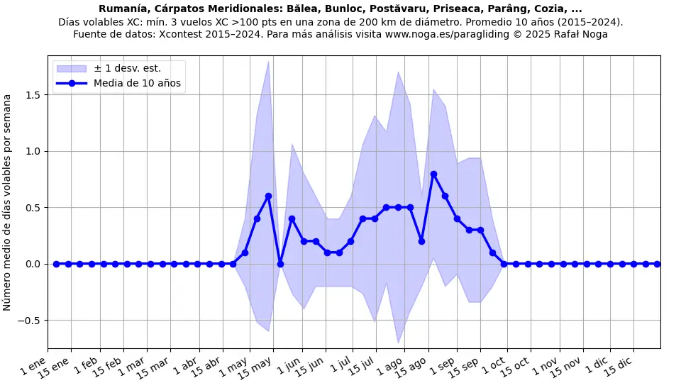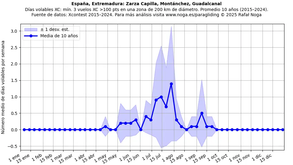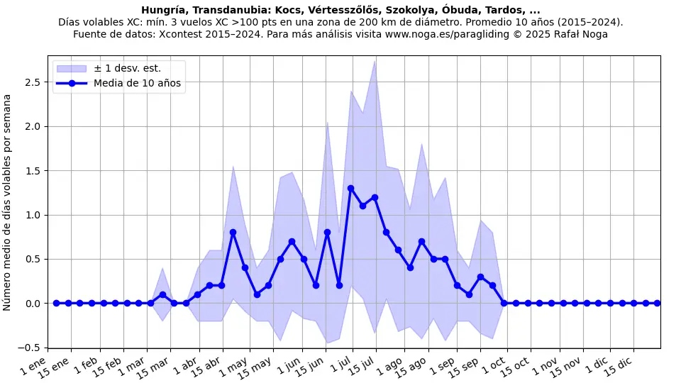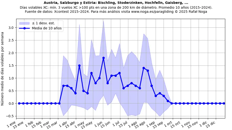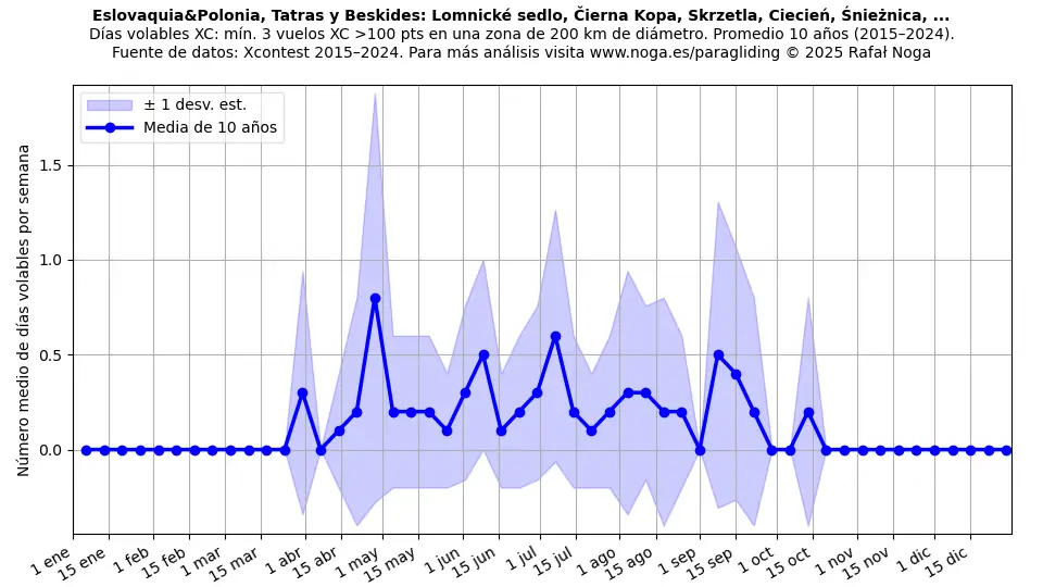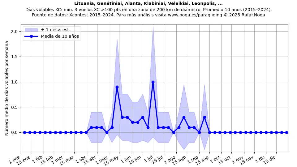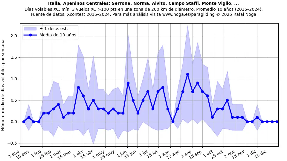 Los días volables se definen como días con un mínimo de 3 vuelos, cada uno con más de 100 puntos y registrados en una zona de 200 km de diámetro. Promedios calculados sobre 11 años. Fuente: Xcontest 2015–2025.
