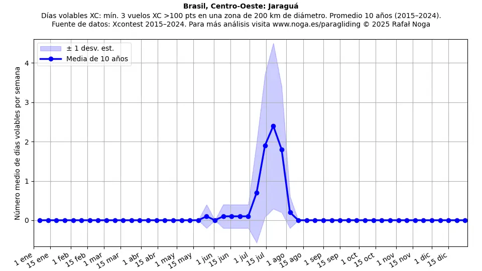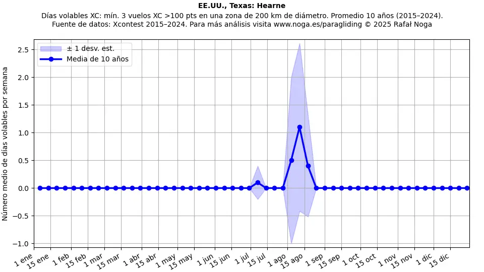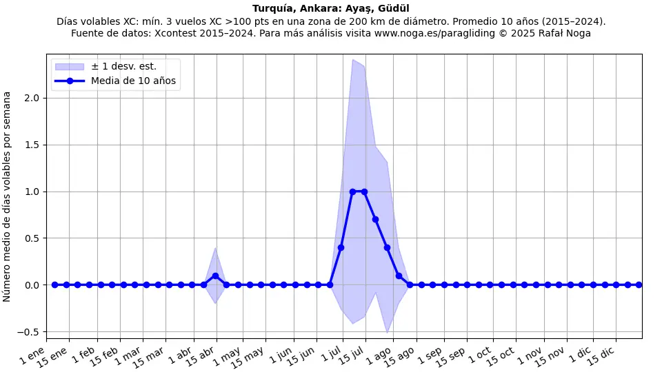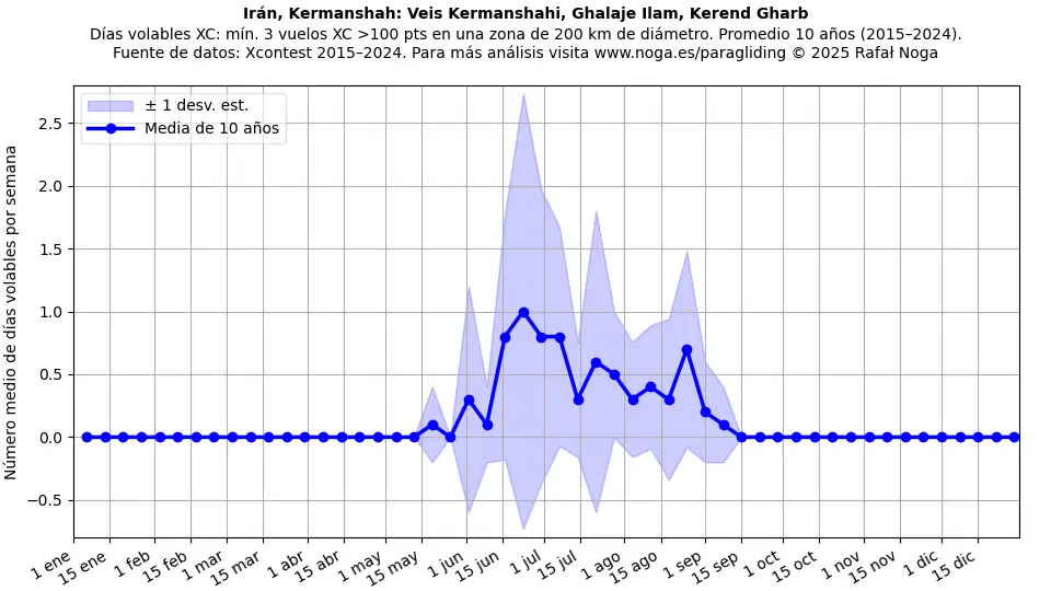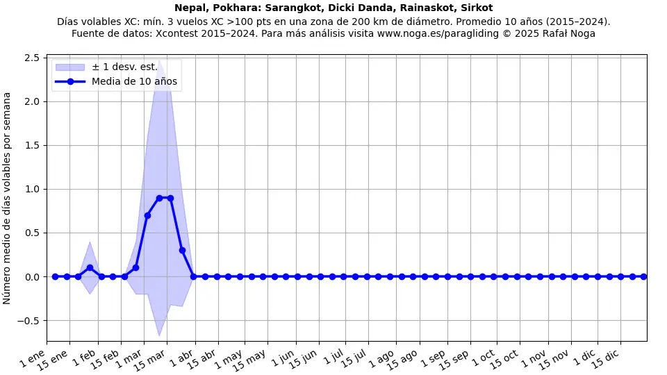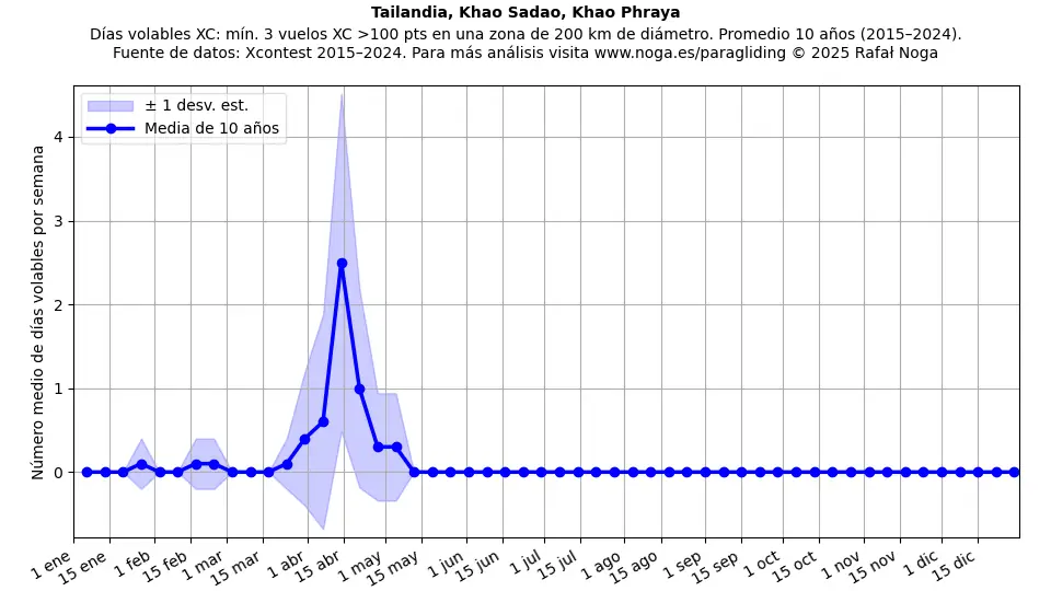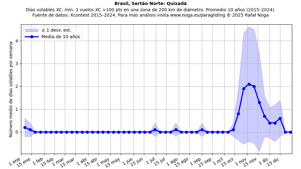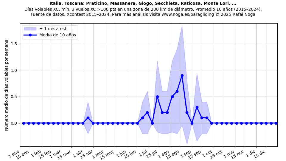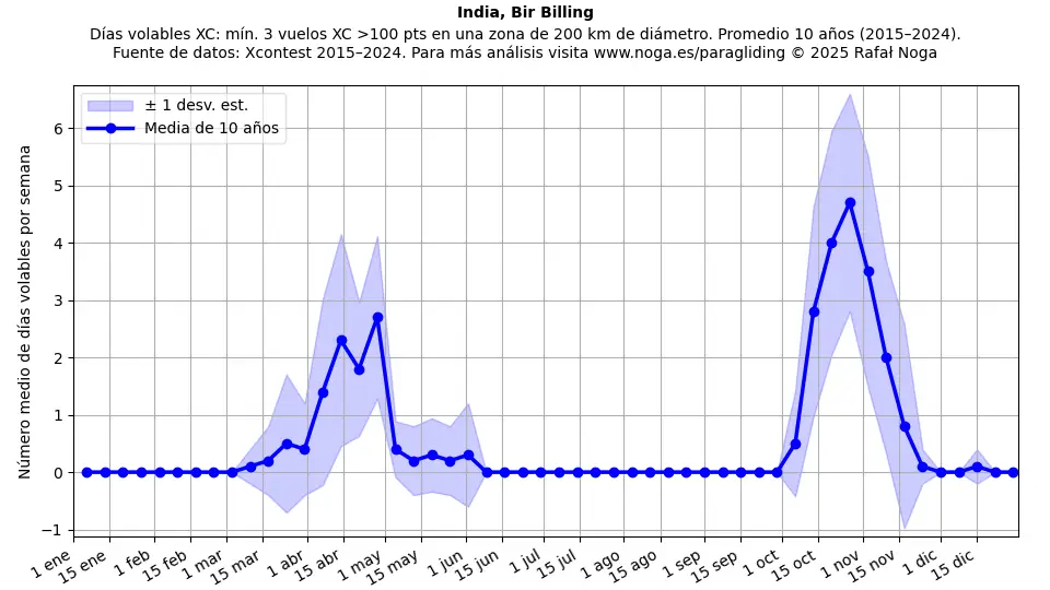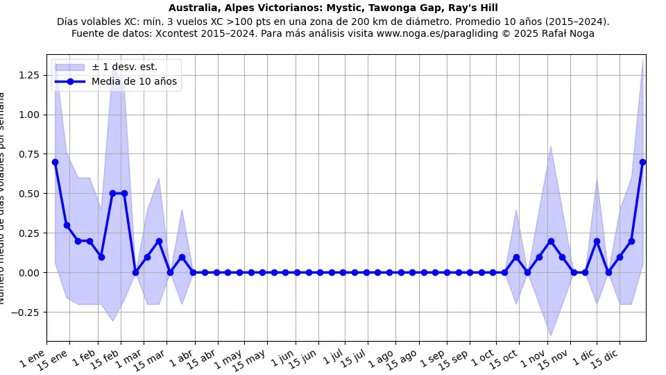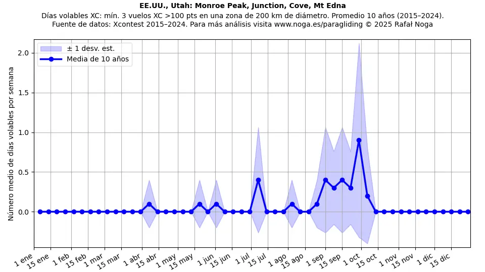 Los días volables se definen como días con un mínimo de 3 vuelos, cada uno con más de 100 puntos y registrados en una zona de 200 km de diámetro. Promedios calculados sobre 11 años. Fuente: Xcontest 2015–2025.