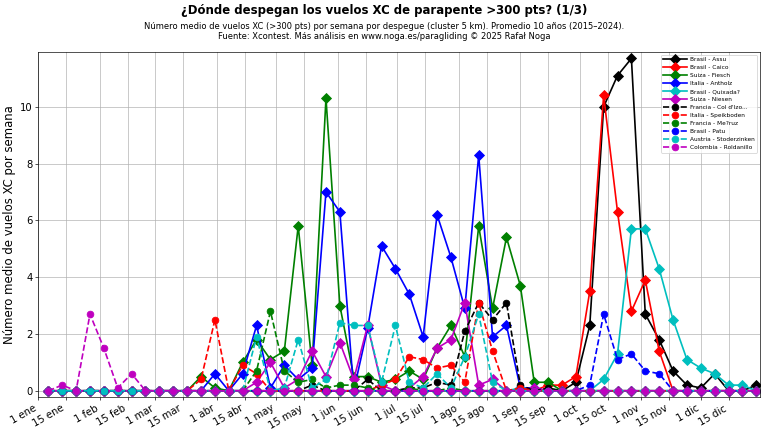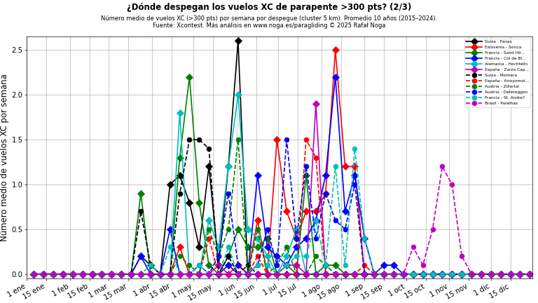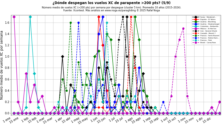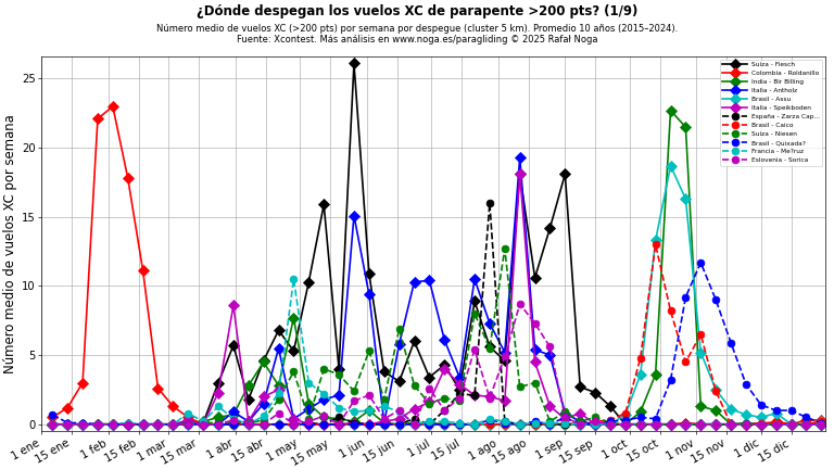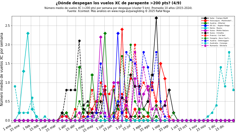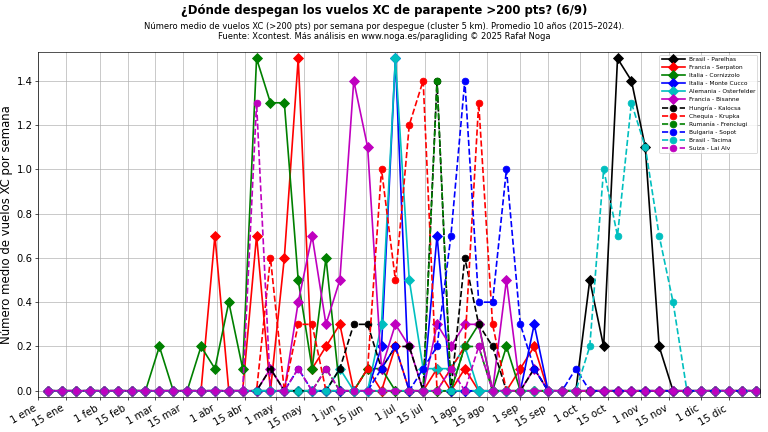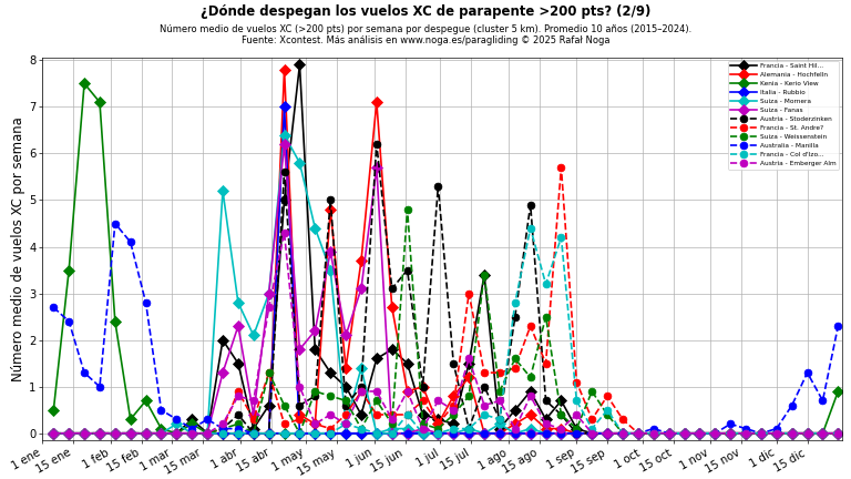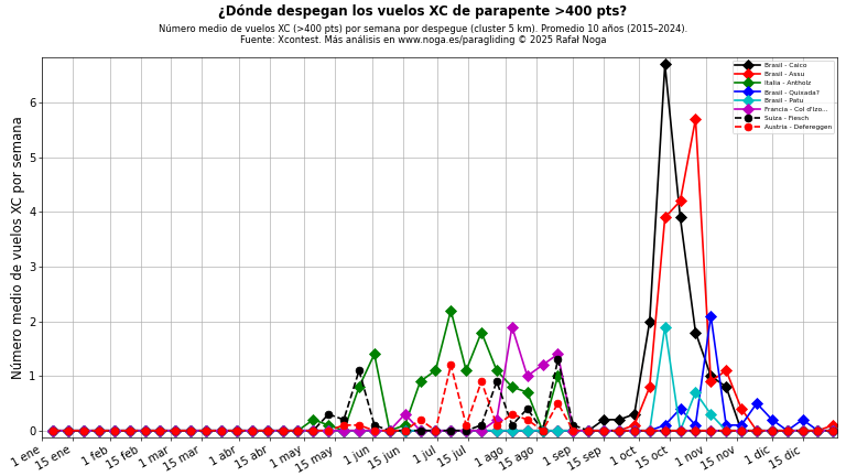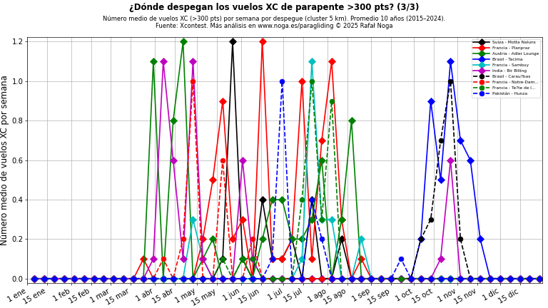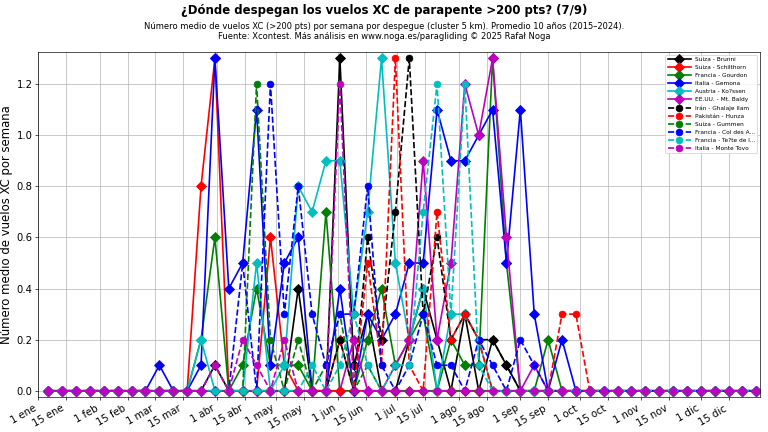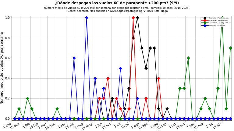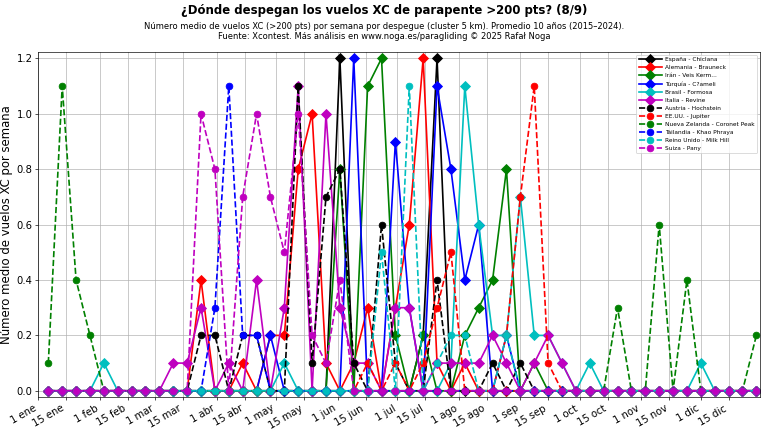 Número medio de vuelos XC (>100 puntos) por semana por despegue (cluster de 5 km), promedio de 10 años (2015–2024). Haz clic en cualquier gráfico para verlo a tamaño completo. Fuente: Xcontest.