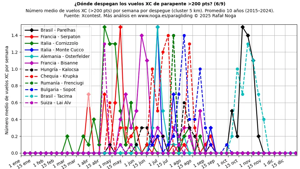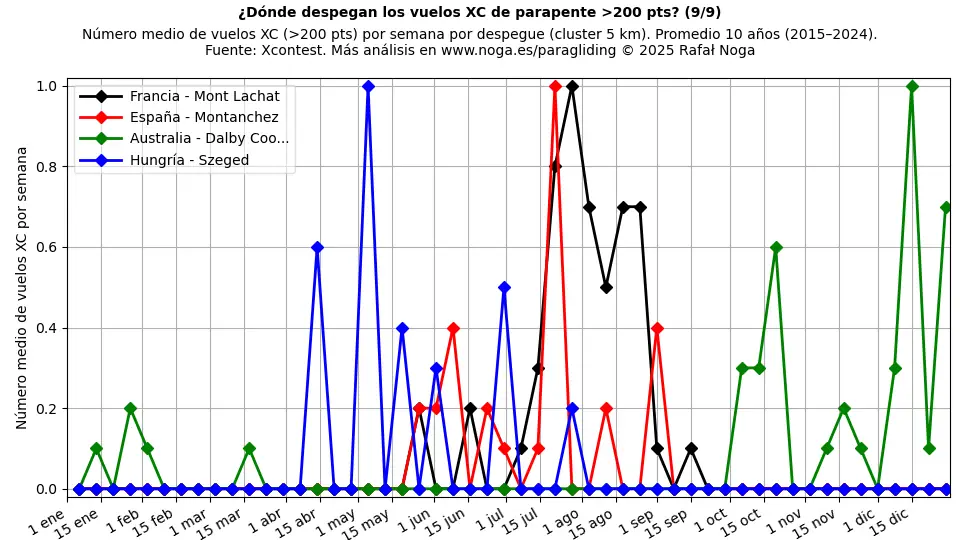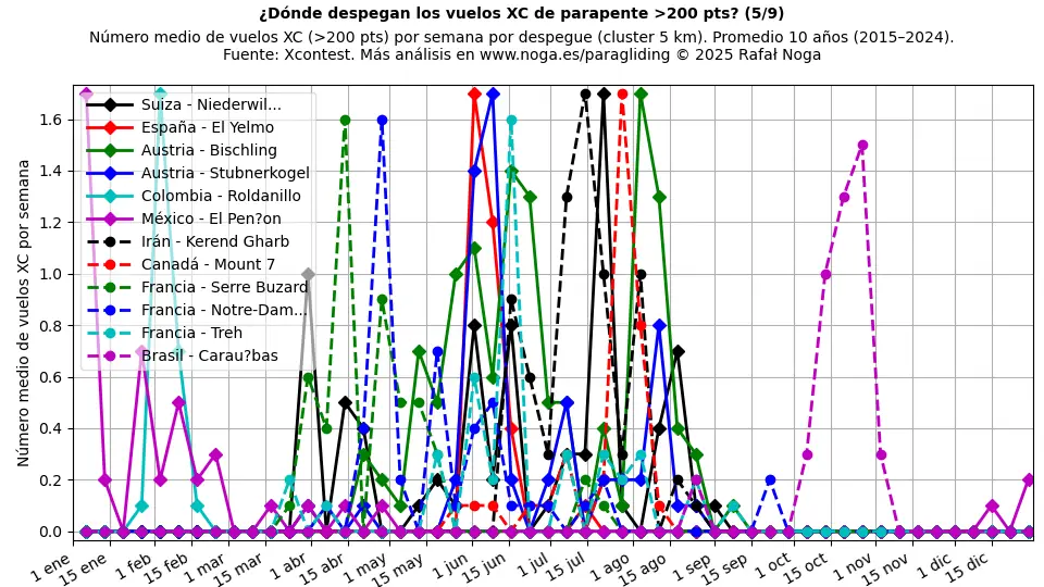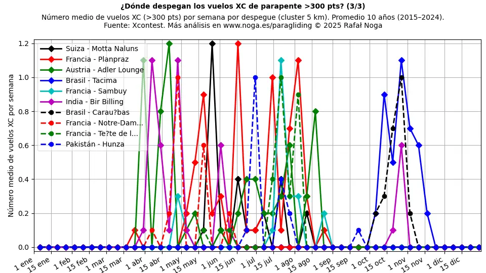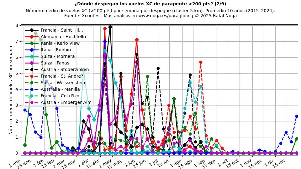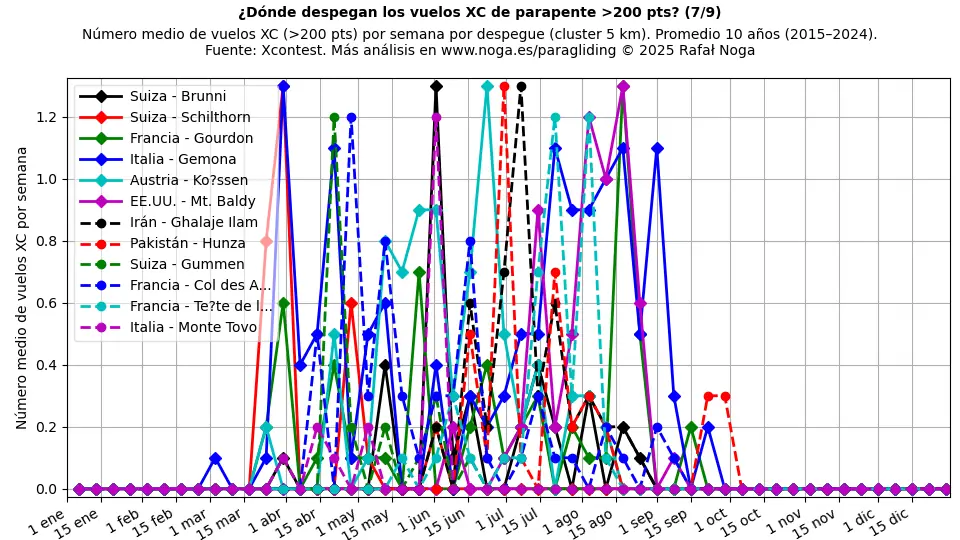 Número medio de vuelos XC (>100 puntos) por semana por despegue (cluster 2 km+4 km dos pasos), promedio de 11 años (2015–2025). Haz clic en cualquier gráfico para verlo a tamaño completo. Fuente: Xcontest.