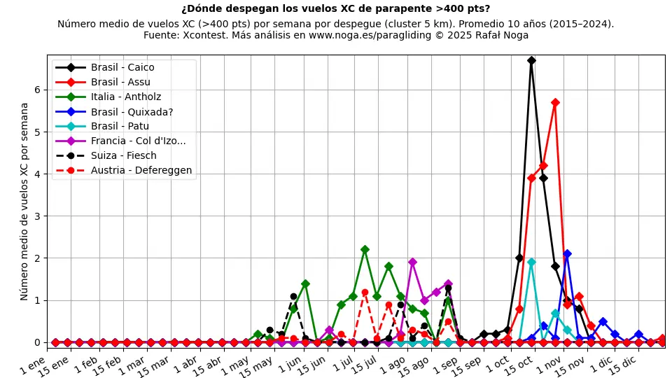Número medio de vuelos XC por semana por despegue (cluster 2 km+4 km dos pasos), promedio de 11 años (2015–2025). Fuente: Xcontest.