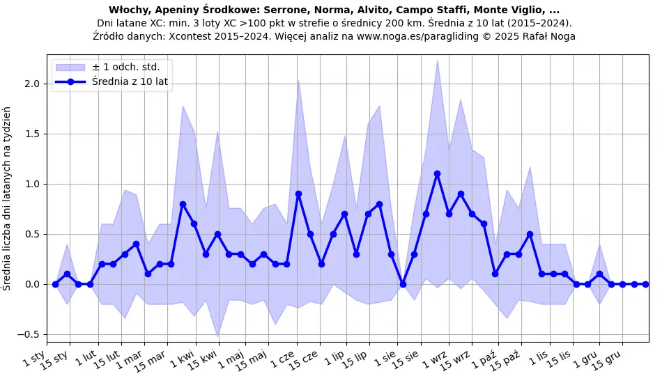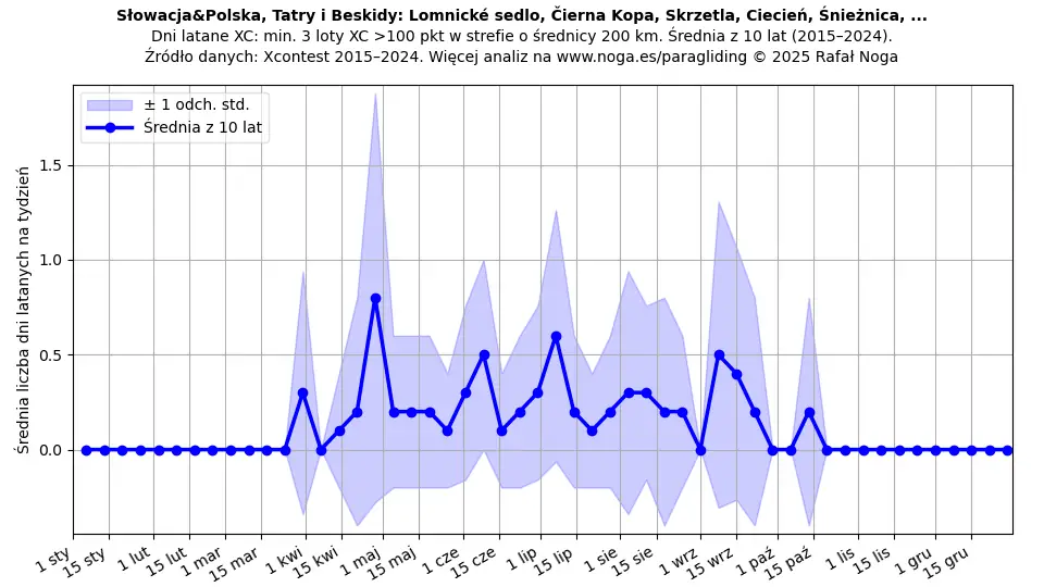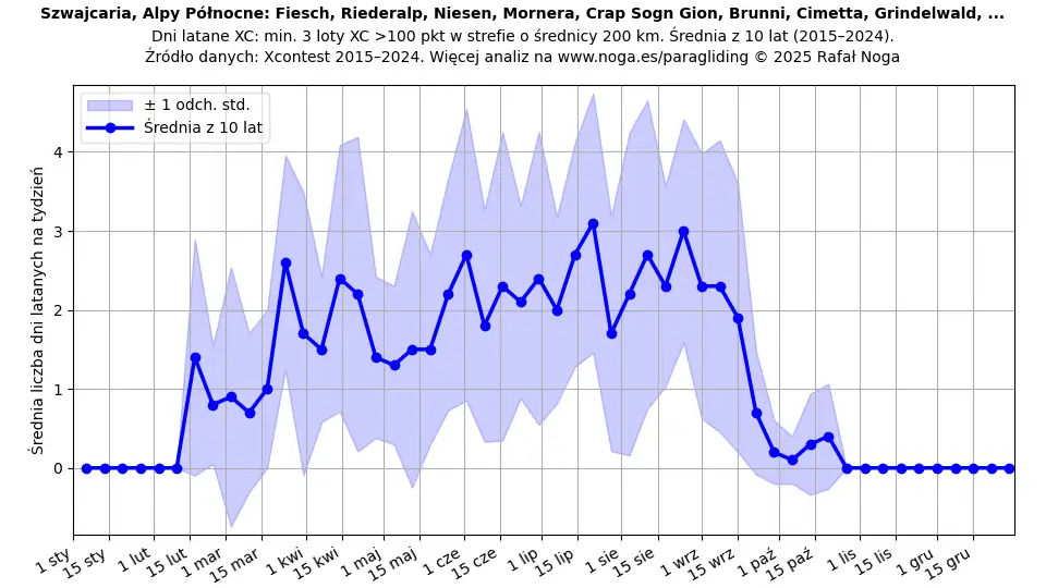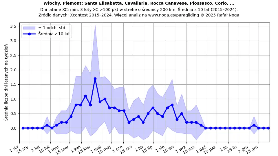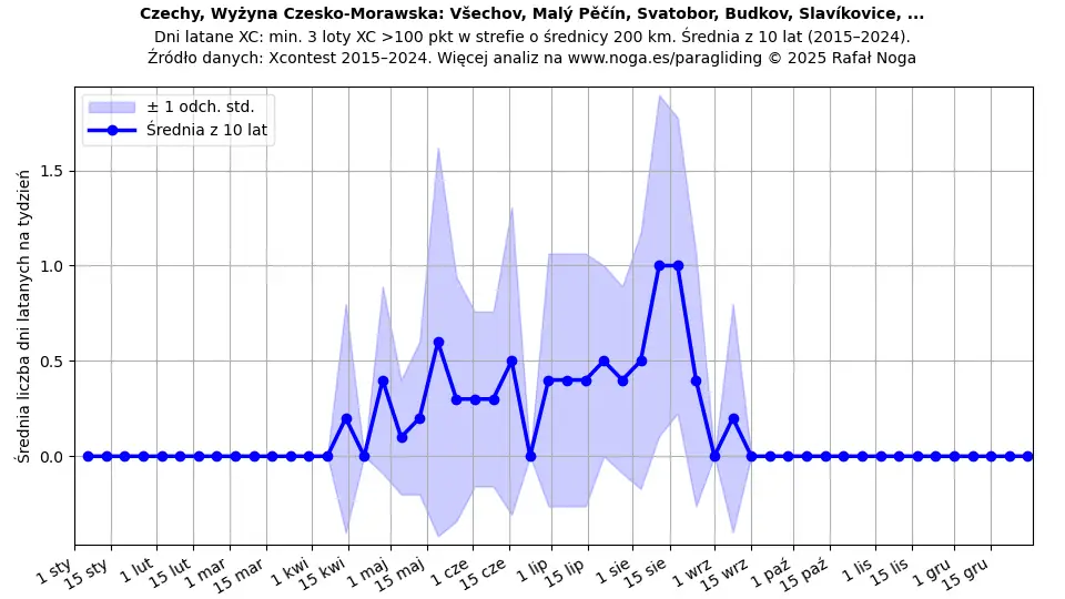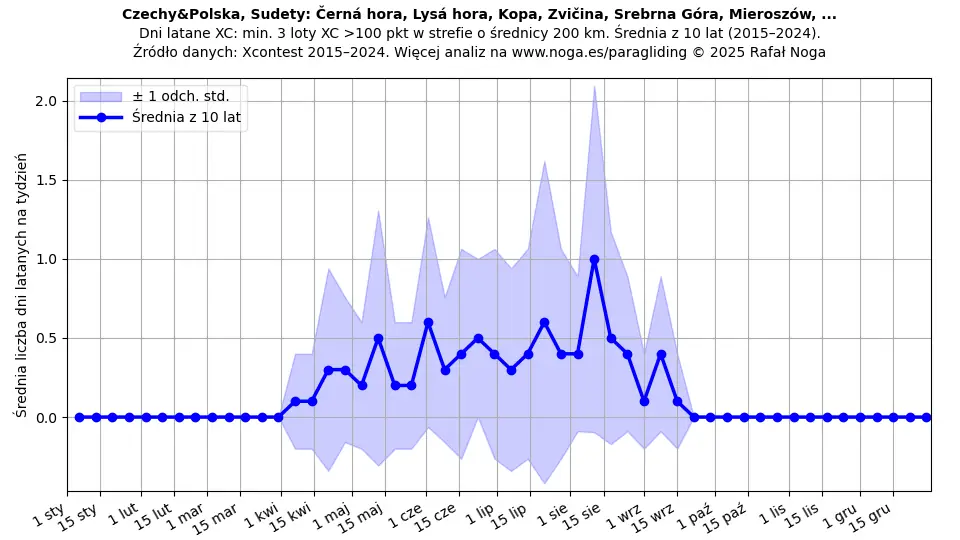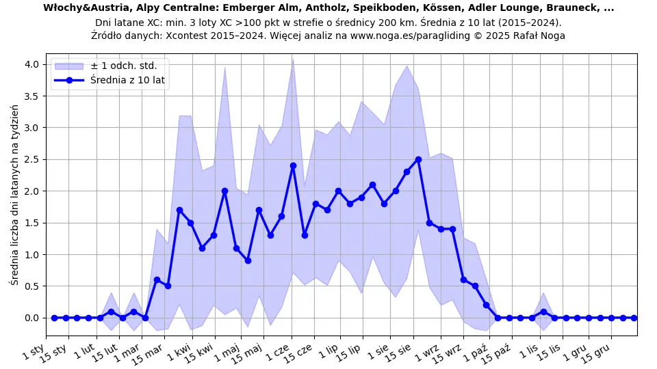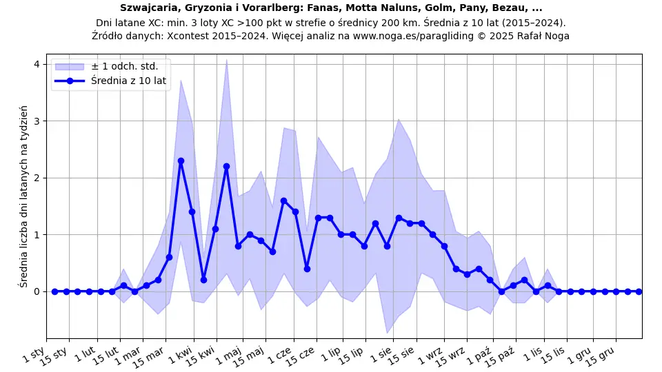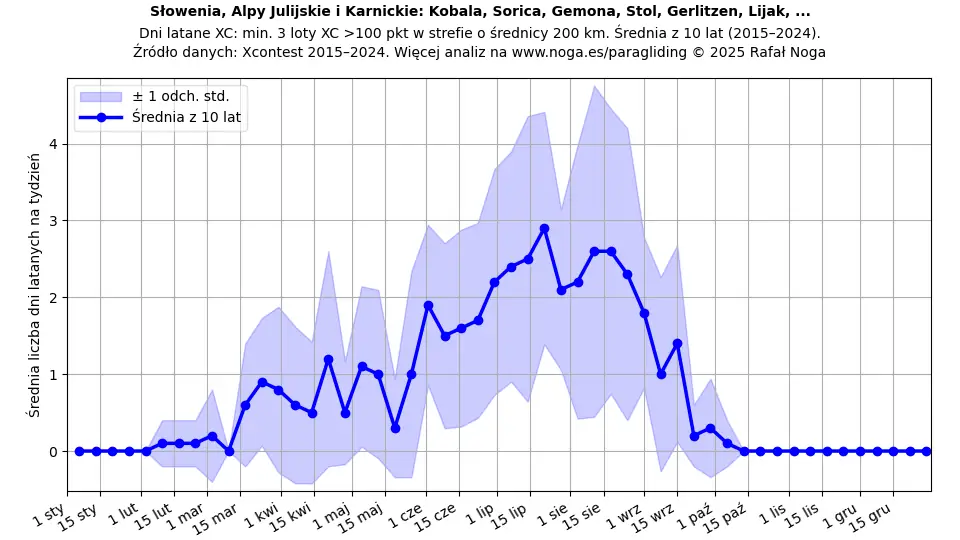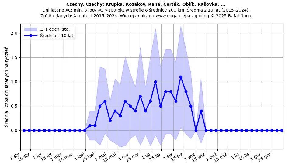 Dni latalne to dni z minimum 3 lotami, każdy powyżej 100 punktów, zarejestrowanymi w strefie o średnicy 200 km. Średnie obliczone z 11 lat. Źródło danych: Xcontest 2015–2025.