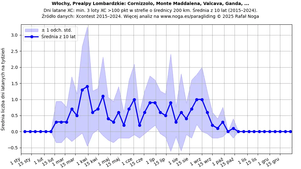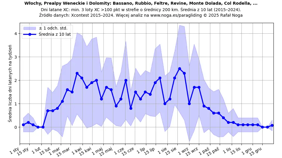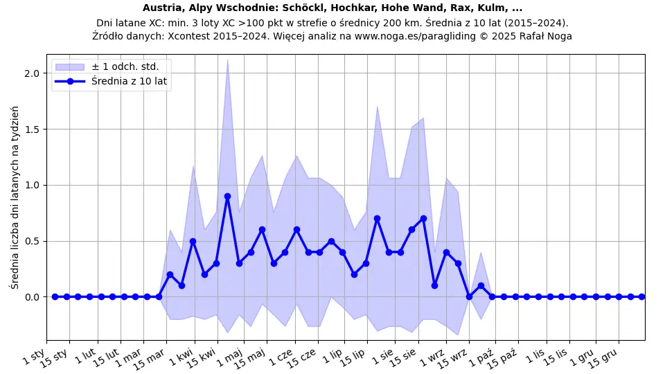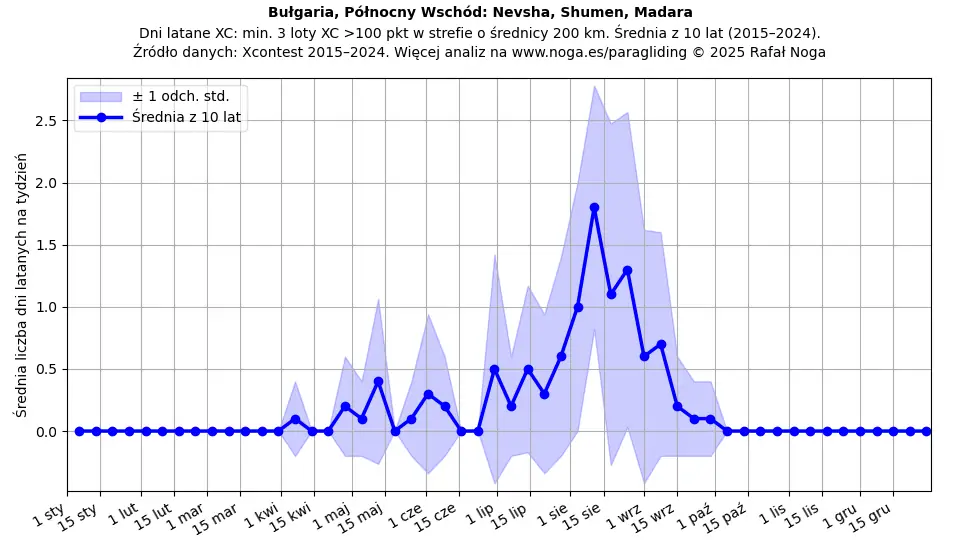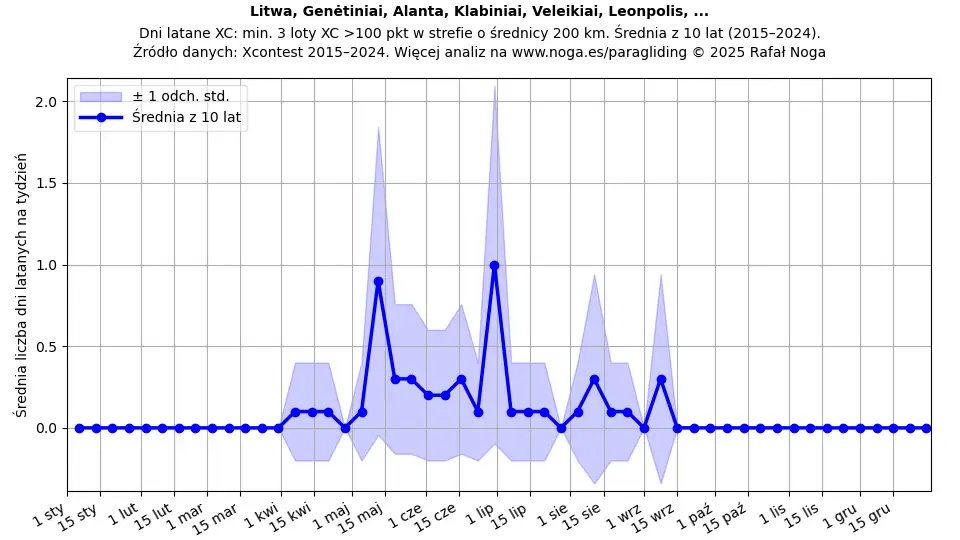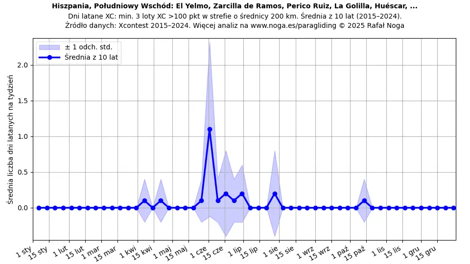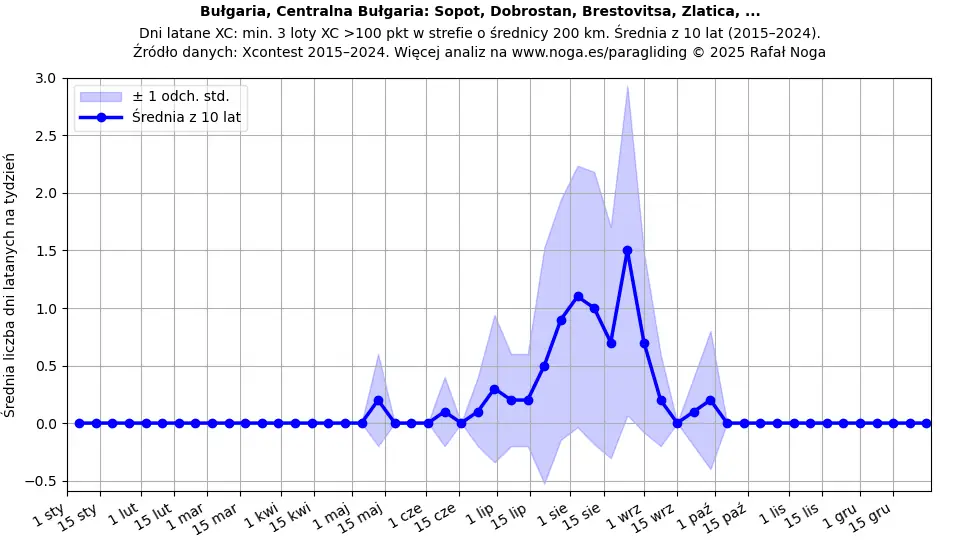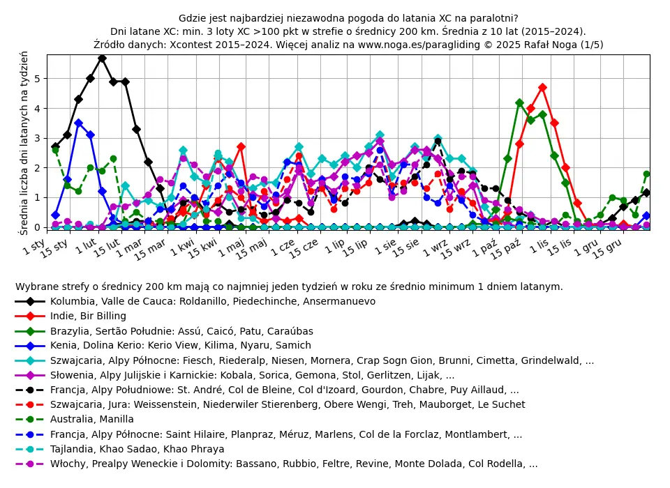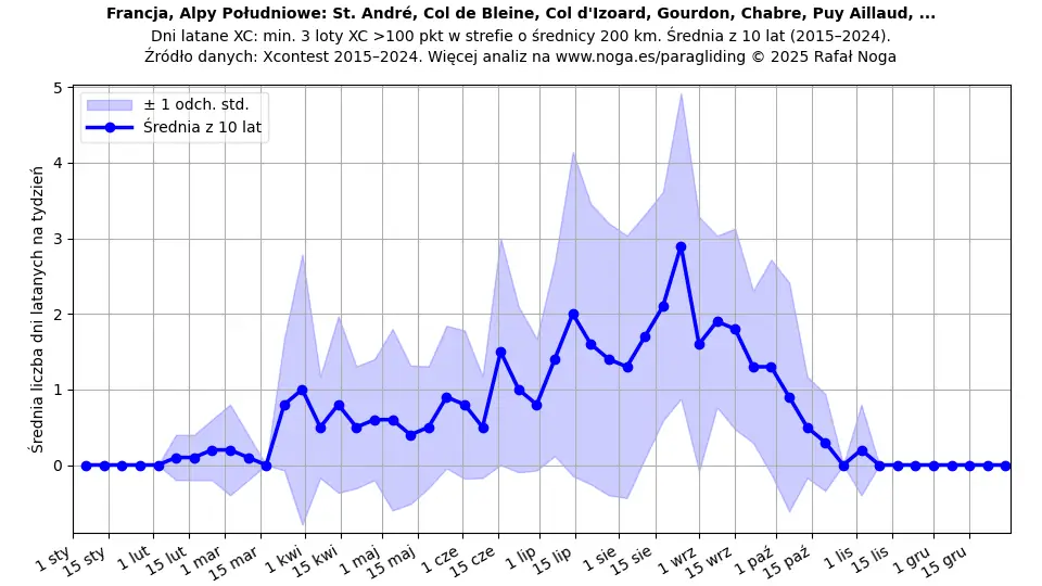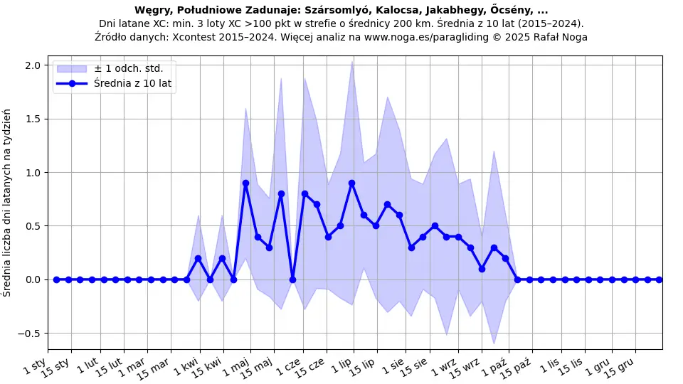Dni latalne to dni z minimum 3 lotami, każdy powyżej 100 punktów, zarejestrowanymi w strefie o średnicy 200 km. Średnie obliczone z 11 lat. Źródło danych: Xcontest 2015–2025.