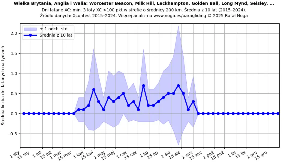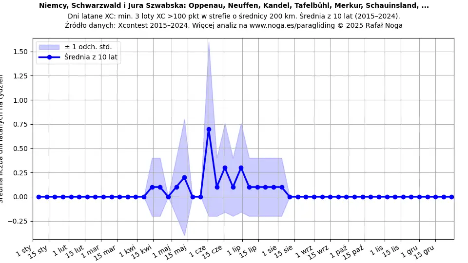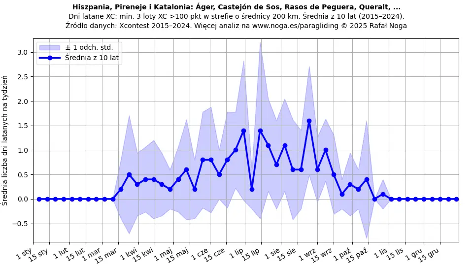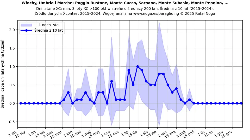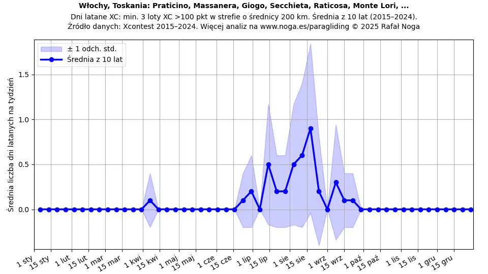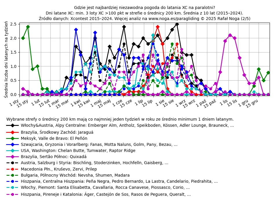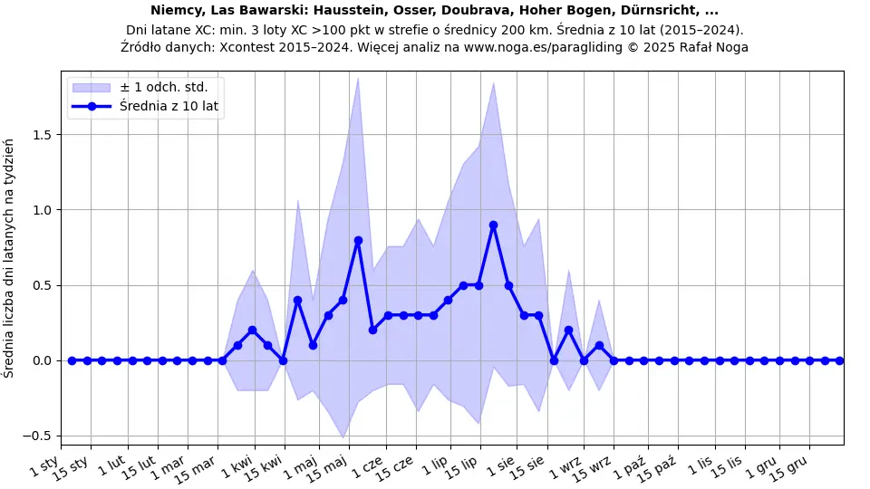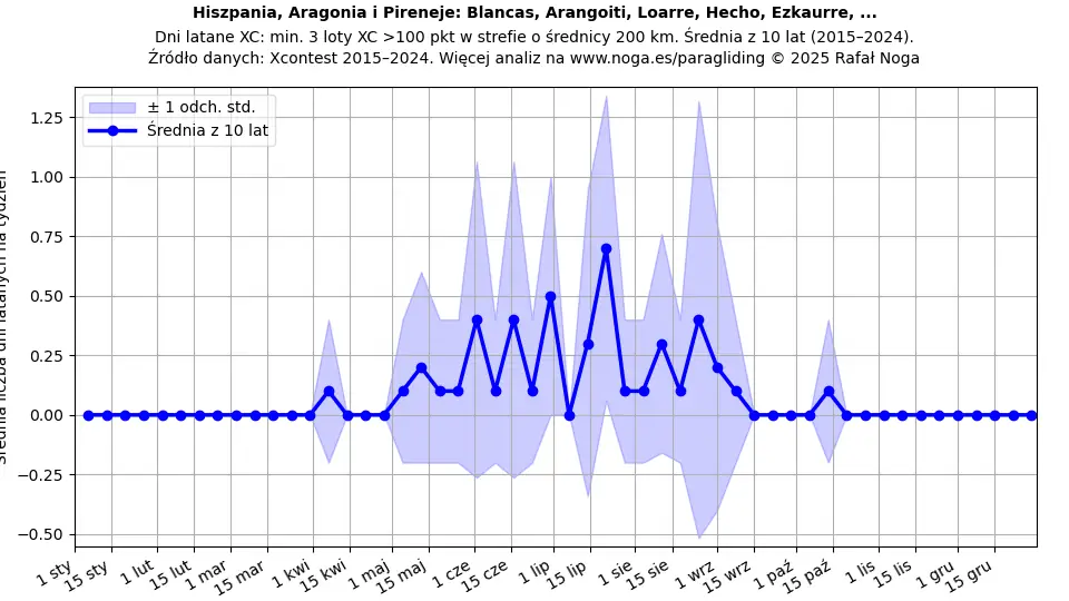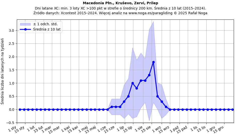 Dni latalne to dni z minimum 3 lotami, każdy powyżej 100 punktów, zarejestrowanymi w strefie o średnicy 200 km. Średnie obliczone z 11 lat. Źródło danych: Xcontest 2015–2025.