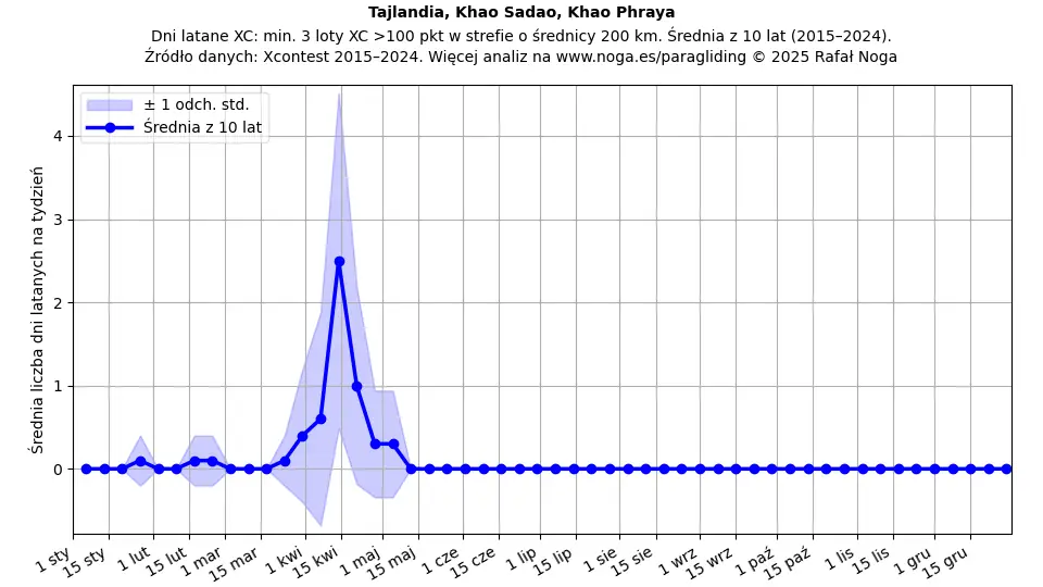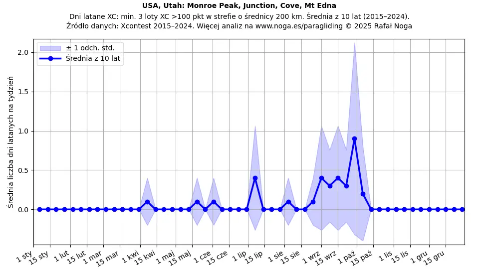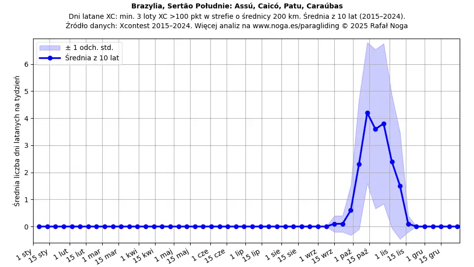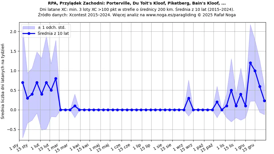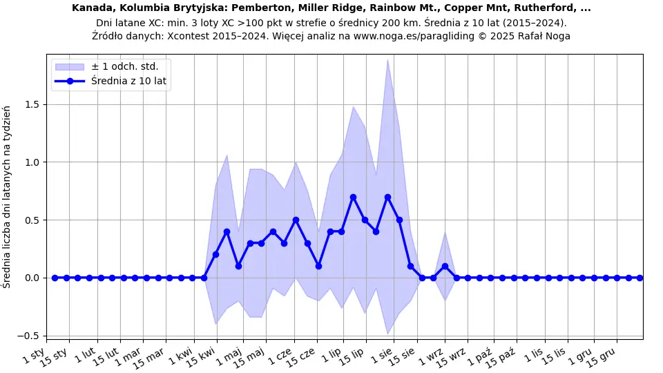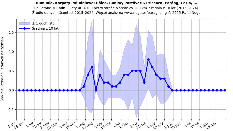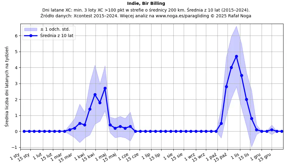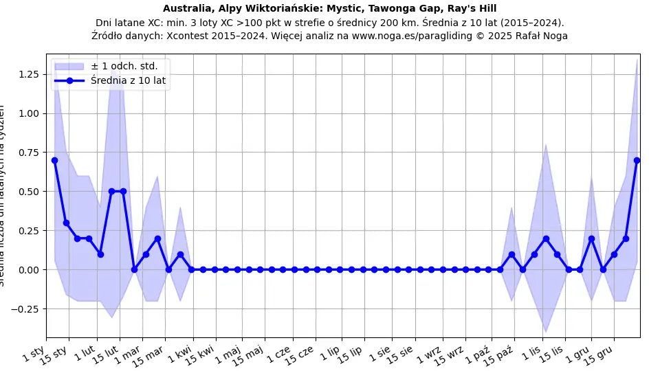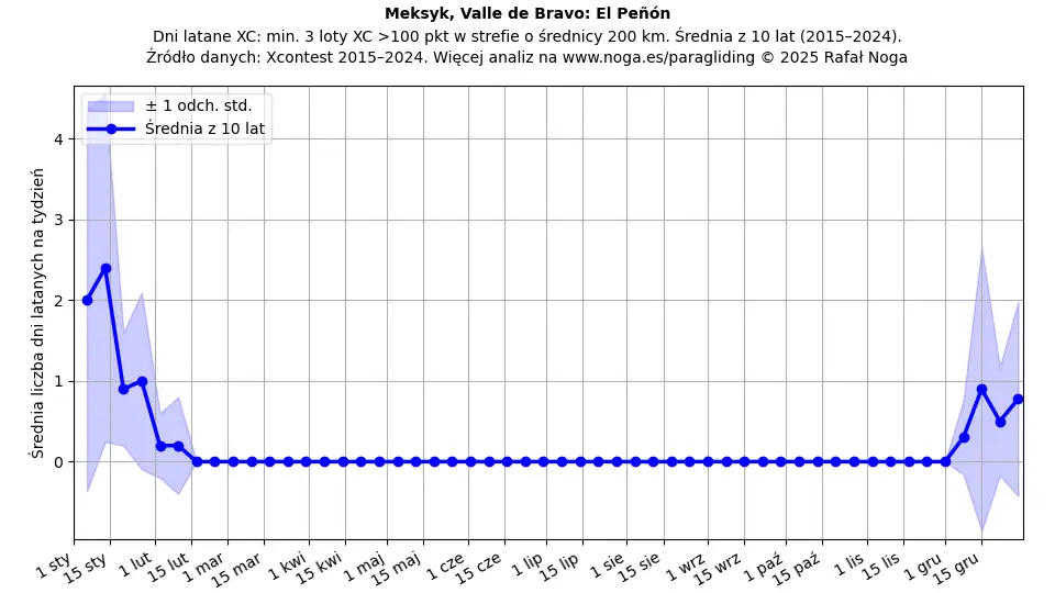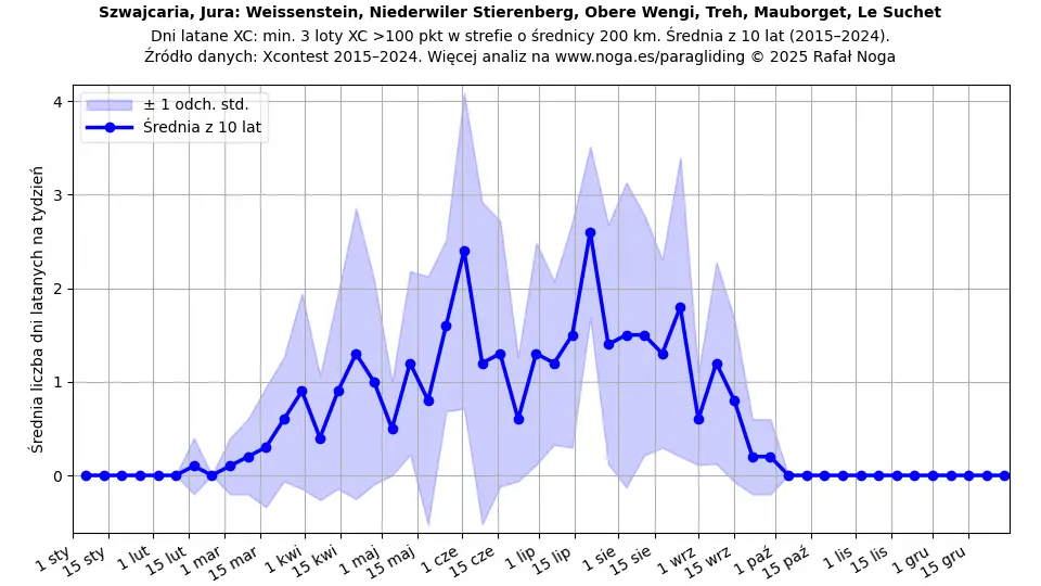 Dni latalne to dni z minimum 3 lotami, każdy powyżej 100 punktów, zarejestrowanymi w strefie o średnicy 200 km. Średnie obliczone z 11 lat. Źródło danych: Xcontest 2015–2025.