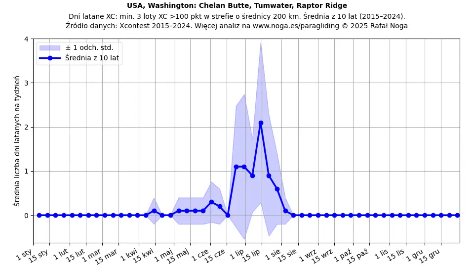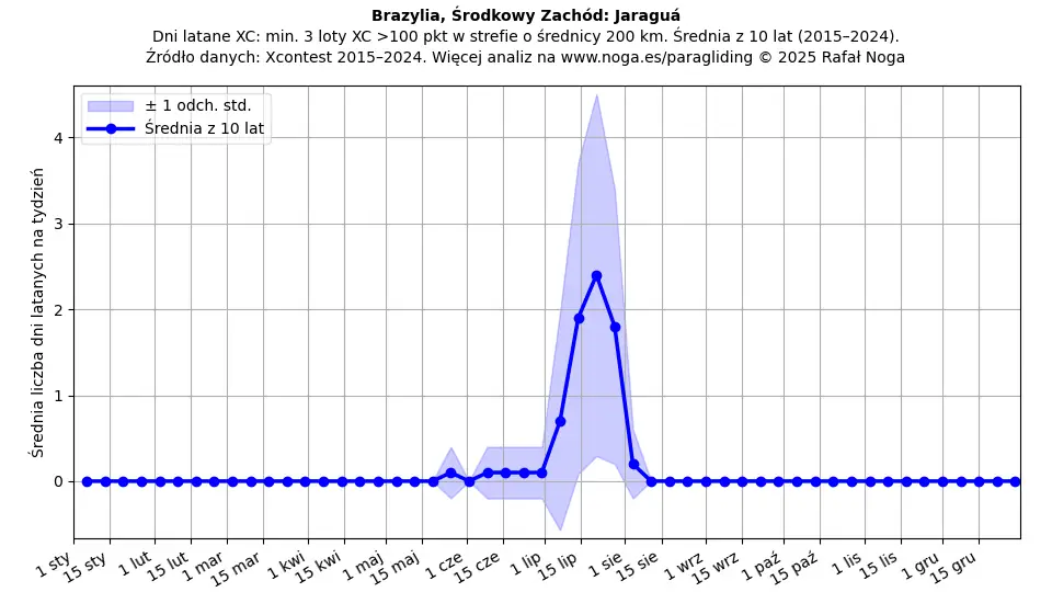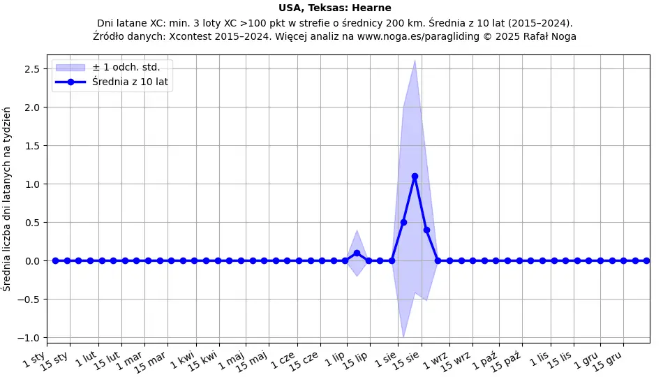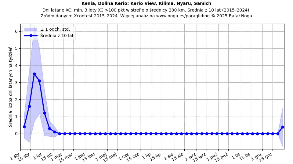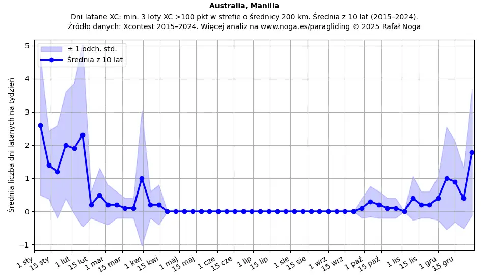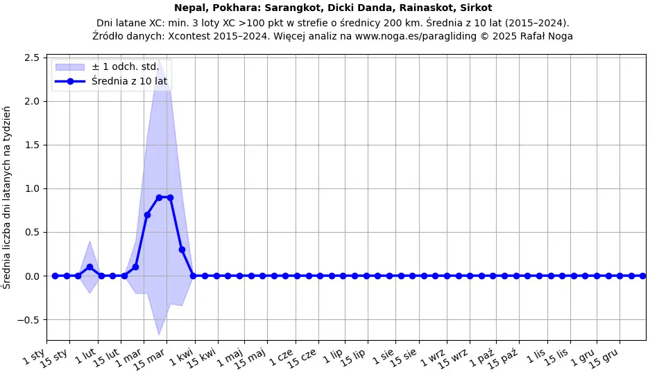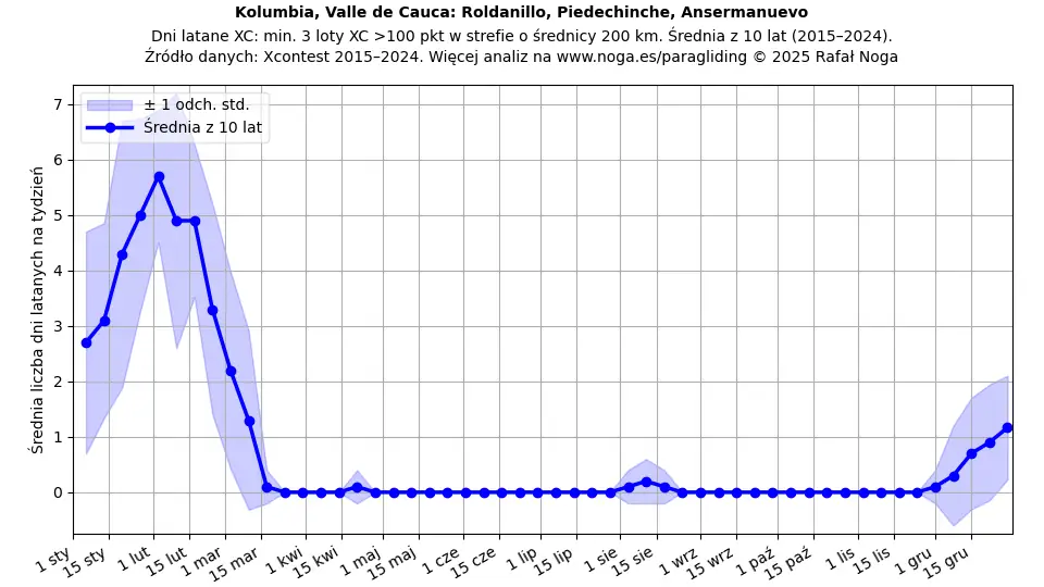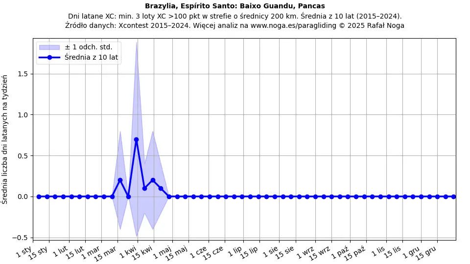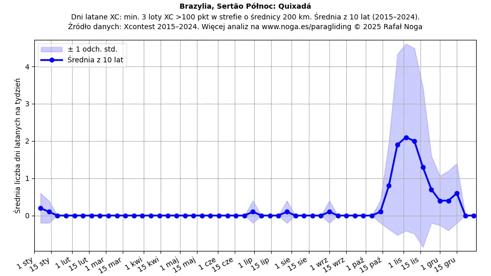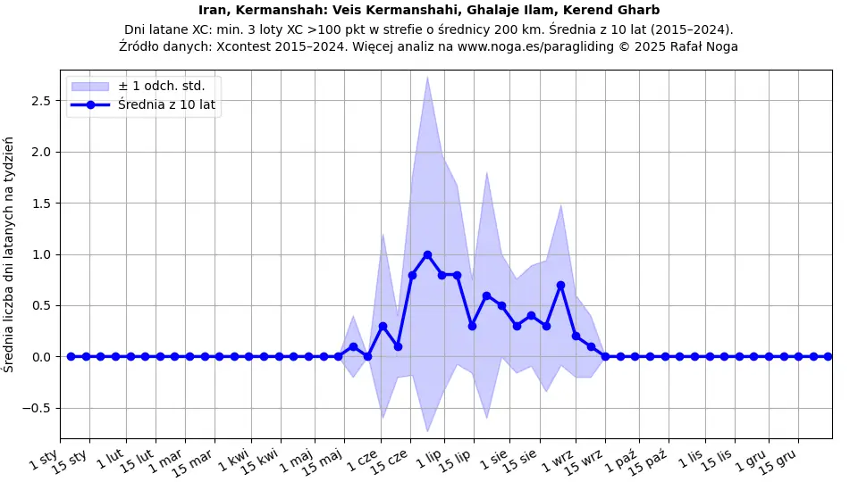 Dni latalne to dni z minimum 3 lotami, każdy powyżej 100 punktów, zarejestrowanymi w strefie o średnicy 200 km. Średnie obliczone z 11 lat. Źródło danych: Xcontest 2015–2025.
