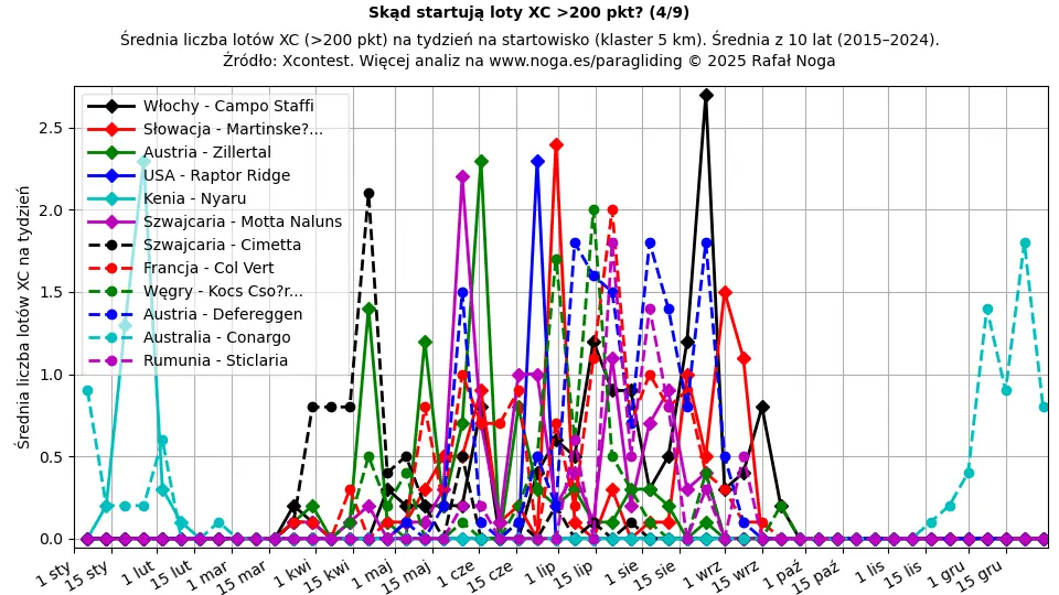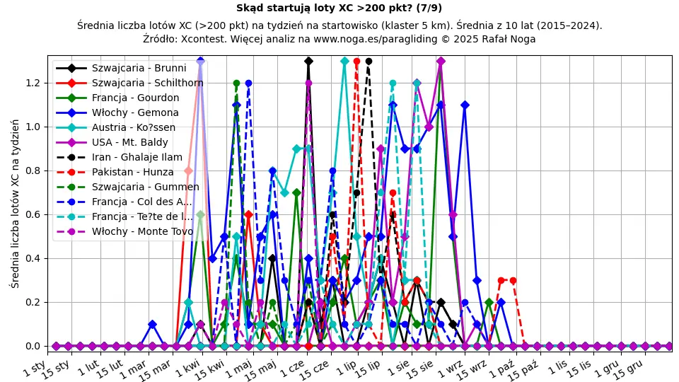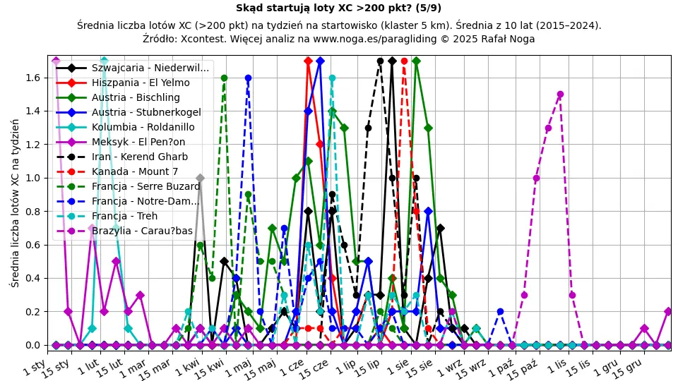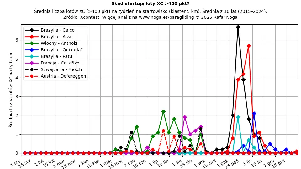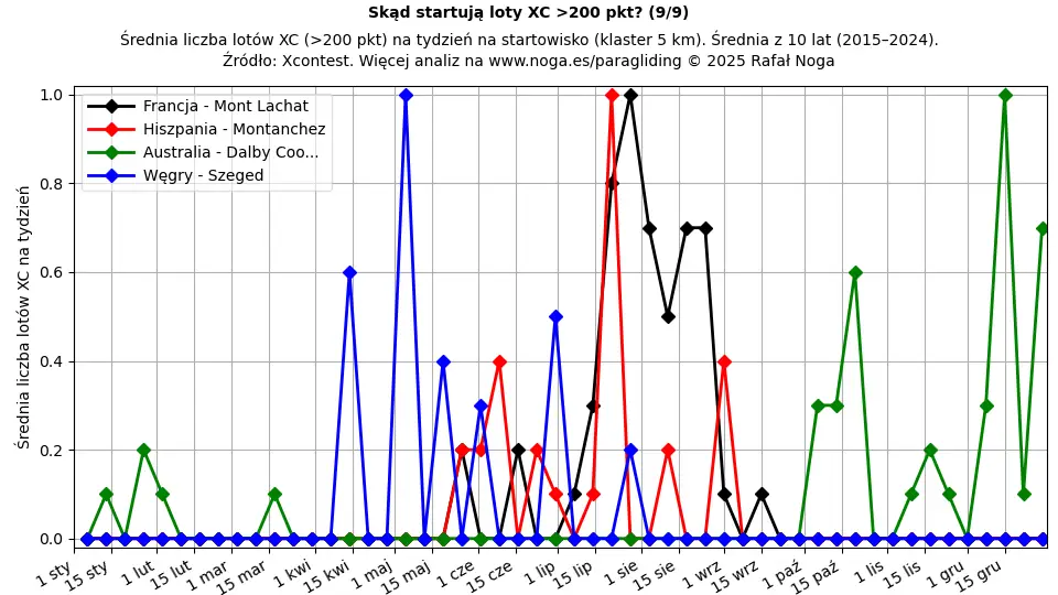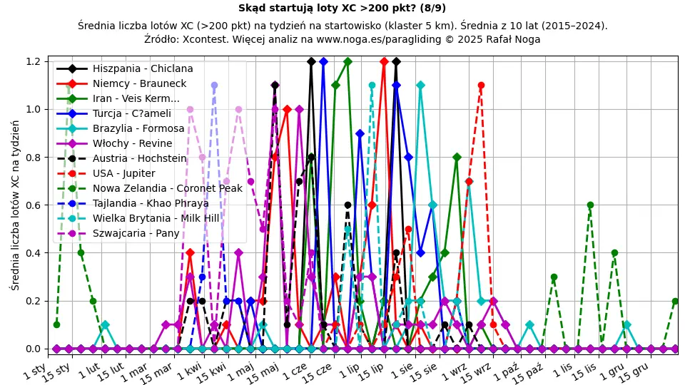 Średnia liczba lotów XC (>100 pkt.) na tydzień na start (klaster 2 km+4 km dwuprzeb.), średnia z 11 lat (2015–2025). Kliknij wykres aby zobaczyć go w pełnym rozmiarze. Źródło danych: Xcontest.