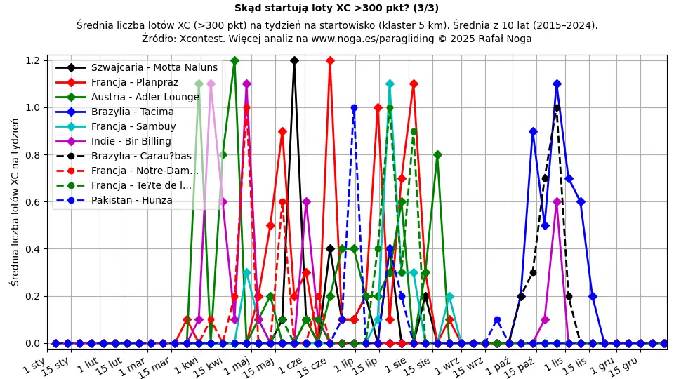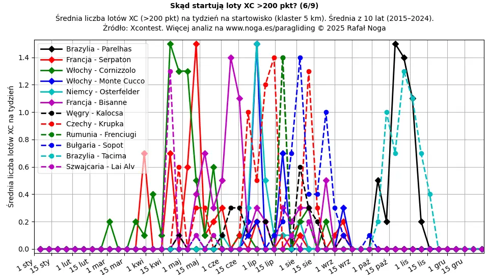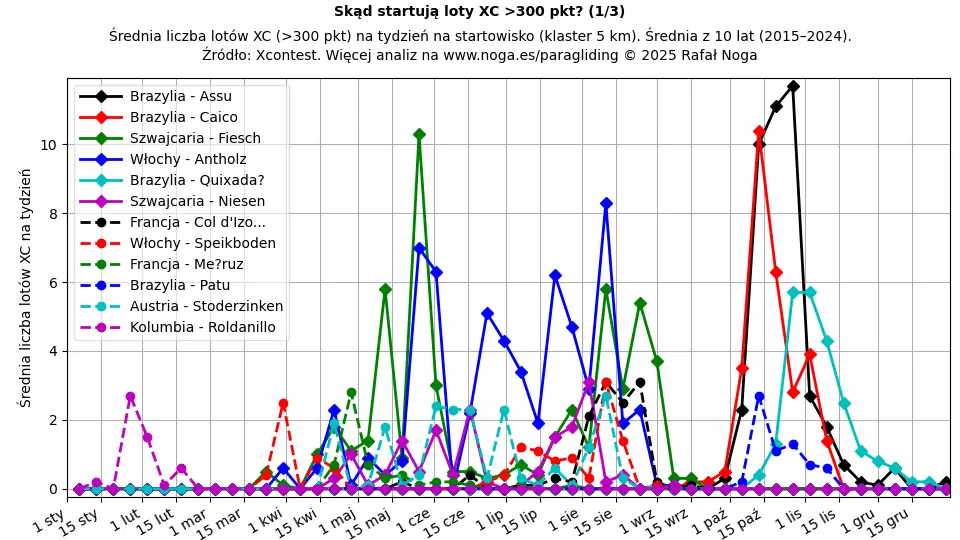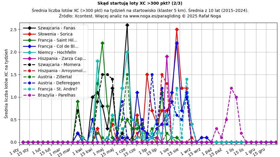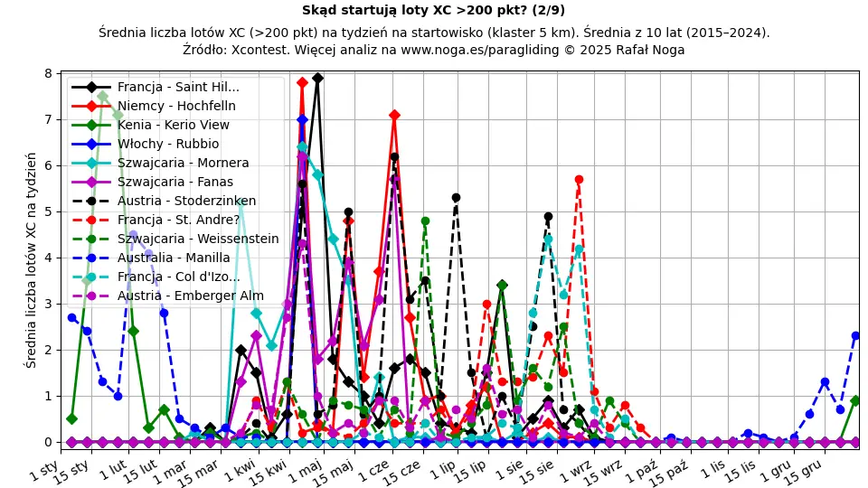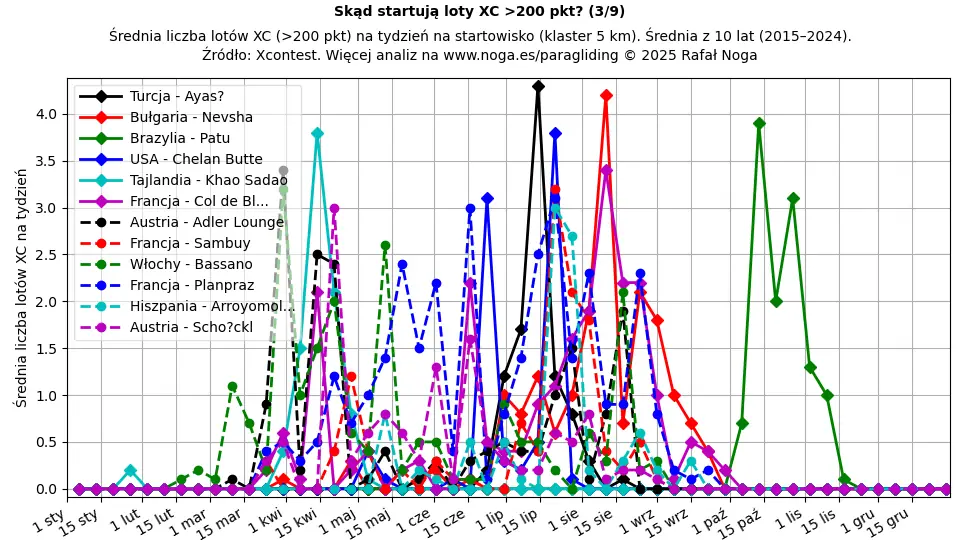 Średnia liczba lotów XC (>100 pkt.) na tydzień na start (klaster 2 km+4 km dwuprzeb.), średnia z 11 lat (2015–2025). Kliknij wykres aby zobaczyć go w pełnym rozmiarze. Źródło danych: Xcontest.